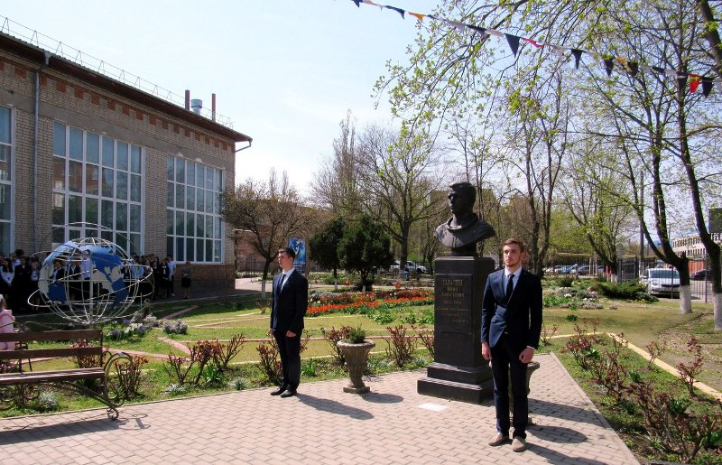 Торжество началось с выноса знамени, после чего почетный караул приступил к своей миссии - нести почетную Вахту памяти возле бюста Гагарина. Лучшие учащиеся возложили цветы к памятнику.