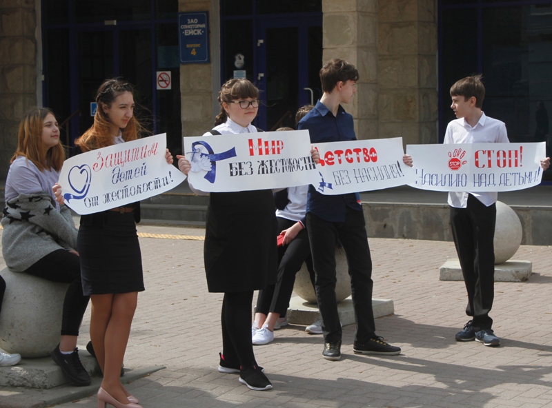 В рамках краевой акции «Синяя лента апреля» сотрудники Ейского комплексного центра социального обслуживания населения совместно с несовершеннолетними, состоящими на профилактическом учете и учащимися школы МБОУ СОШ №2 г. Ейска вышли на улицы города. Они познакомили ейчан с историей, побудившей проводить «Синюю ленту». Цель краевого мероприятия - привлечение внимания общества к проблеме насилия над детьми и подростками в семьях. В уличной акции, направленной на защиту детей от насилия, приняло участие более двух с половиной тысяч человек.