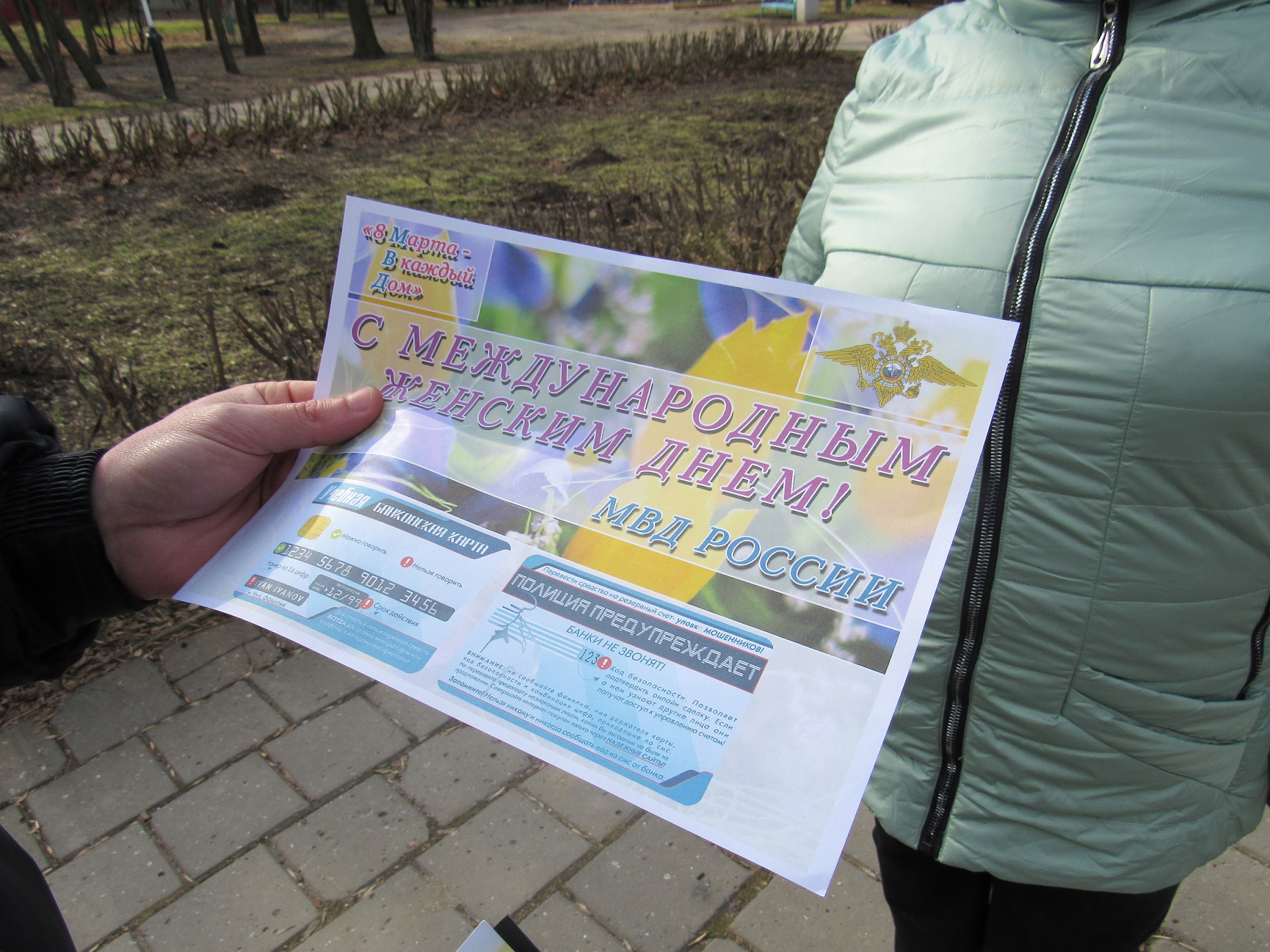 Участковые уполномоченные полиции отдела МВД России по Ейскому району совместно с представителями общественного совета поздравили жительниц своих административных участков с Международным женским днем. Заместитель начальника отдела участковых уполномоченных полиции капитан полиции Игорь Щербаха вручил женщинам поздравительные открытки и напомнил о мерах безопасности при дистанционном мошенничестве. Правоохранители также пожелали участницам акции весеннего настроения, бодрости духа и крепкого здоровья, вручили листовки с контактными номерами телефонов участковых уполномоченных и сладкие подарки. Также, полицейские разместили в домах на обслуживаемой территории листовки с поздравлениями для прекрасной половины населения своих районов. Женщины в свою очередь с радостью принимали поздравления и подарки от сотрудников полиции.