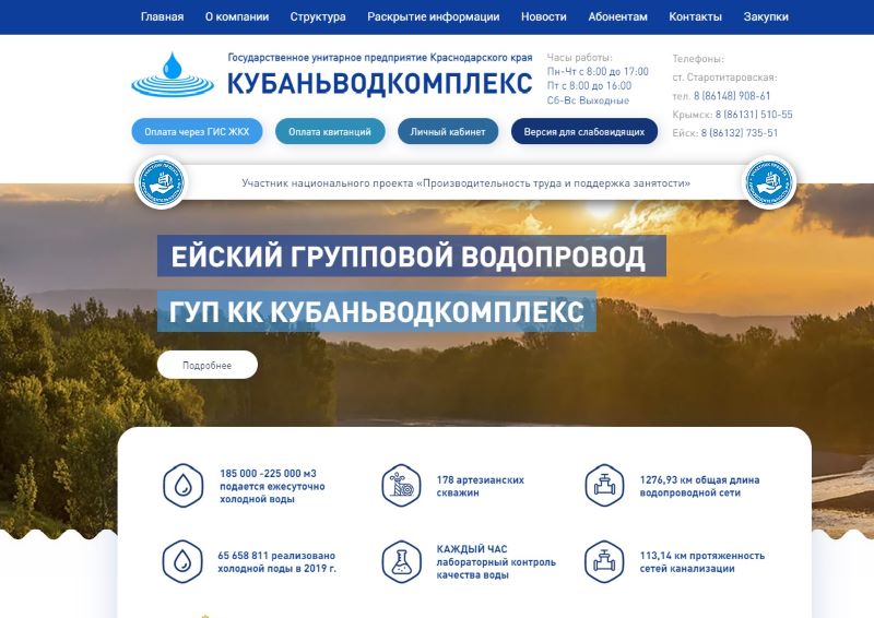 ГУП КК «Кубаньводкомплекс» открыт к диалогу с потребителями. Основная цель предприятия – поставлять стабильно и круглосуточно питьевую воду в города Новороссийск, Геленджик, Крымск, Ейск и населенные пункты Таманского полуострова и северной зоны Краснодарского края. Ежедневно сотрудники Троицкого, Ейского и Таманского групповых водопроводов стремятся выполнять свою работу своевременно и качественно. Именно поэтому предприятие предлагает широкий спектр возможностей для связи как на официальном сайте www.кубаньводкомплекс.рф, так и в социальных сетях.