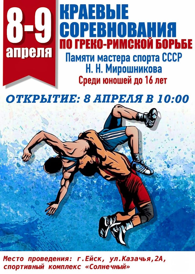 Приглашаем ейчан поддержать наших борцов на краевых соревнованиях по греко-римской борьбе, посвященных памяти мастера спорта СССР Н. Н. Мирошникова