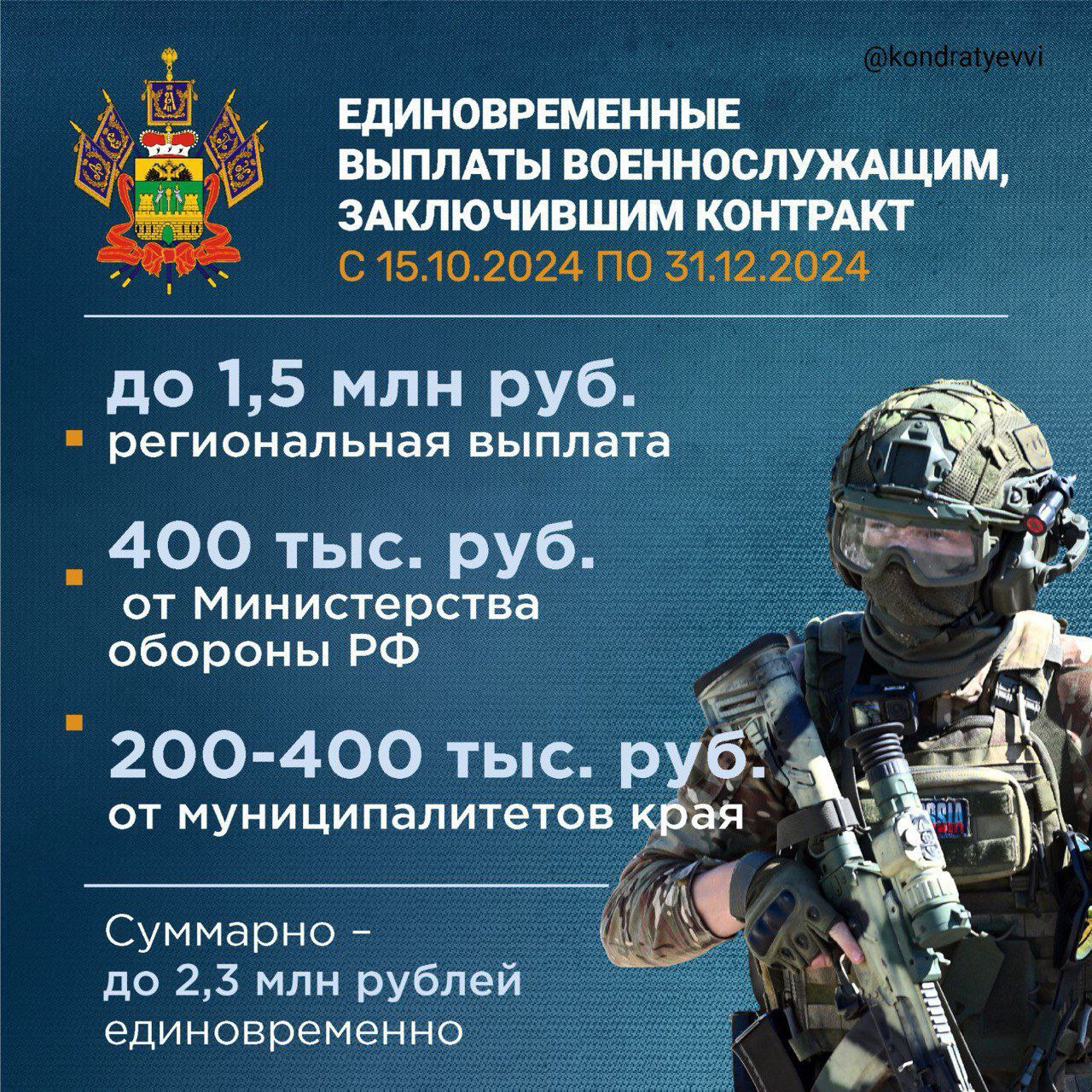 «Приняли решение увеличить единовременную выплату от Краснодарского края военнослужащим, заключившим контракт с Минобороны РФ. С 15 октября она составит 1 миллион 500 тысяч рублей. С учетом выплат от Министерства обороны РФ и муниципалитетов общая сумма может достигать 2 миллионов 300 тысяч рублей. Сохраняем также все меры поддержки семей военнослужащих. Забота о них – в приоритете.» - написал губернатор Вениамин Кондратьев в своем телеграм канале