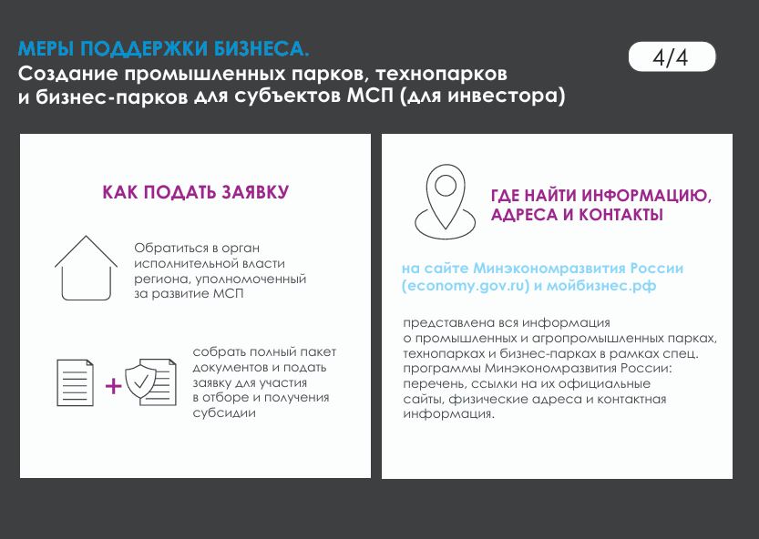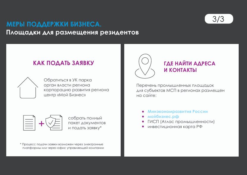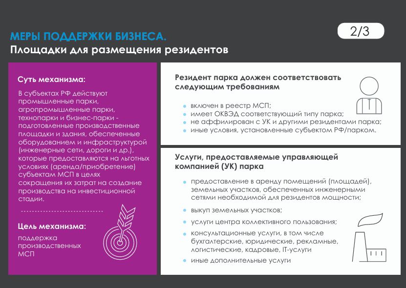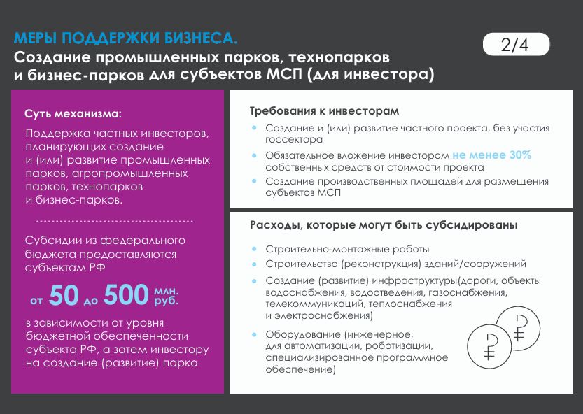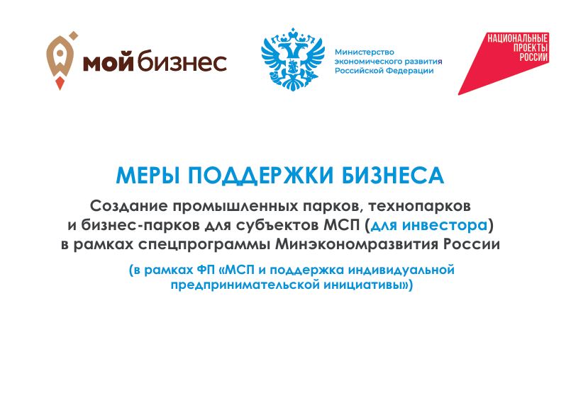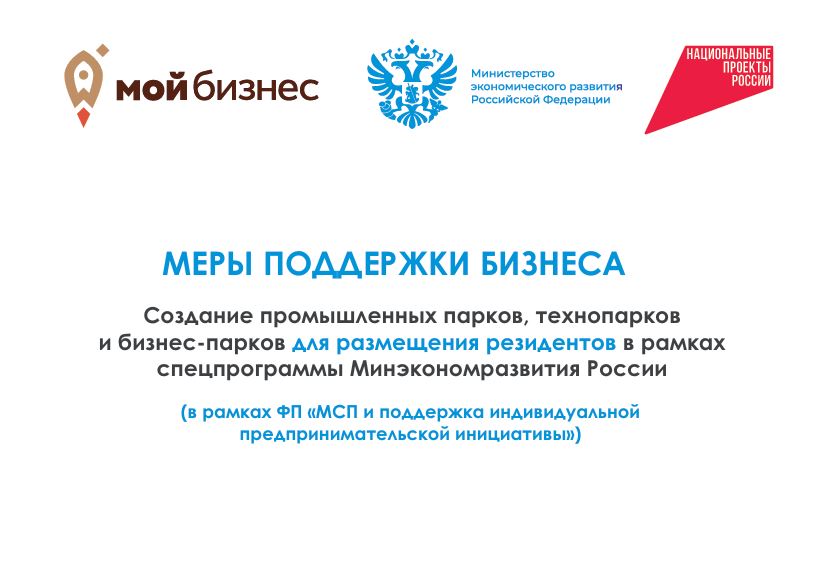 Создание промышленных парков, технопарков и бизнес-парков для размещения резидентов в рамках спецпрограммы Минэкономразвития России.