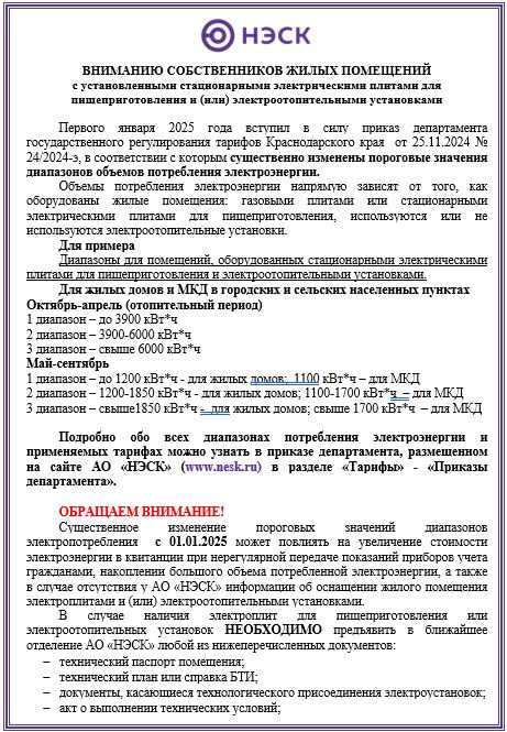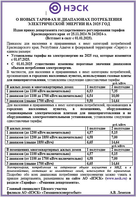 С 01.07.2025 года будут установлены новые тарифы на электроэнергию