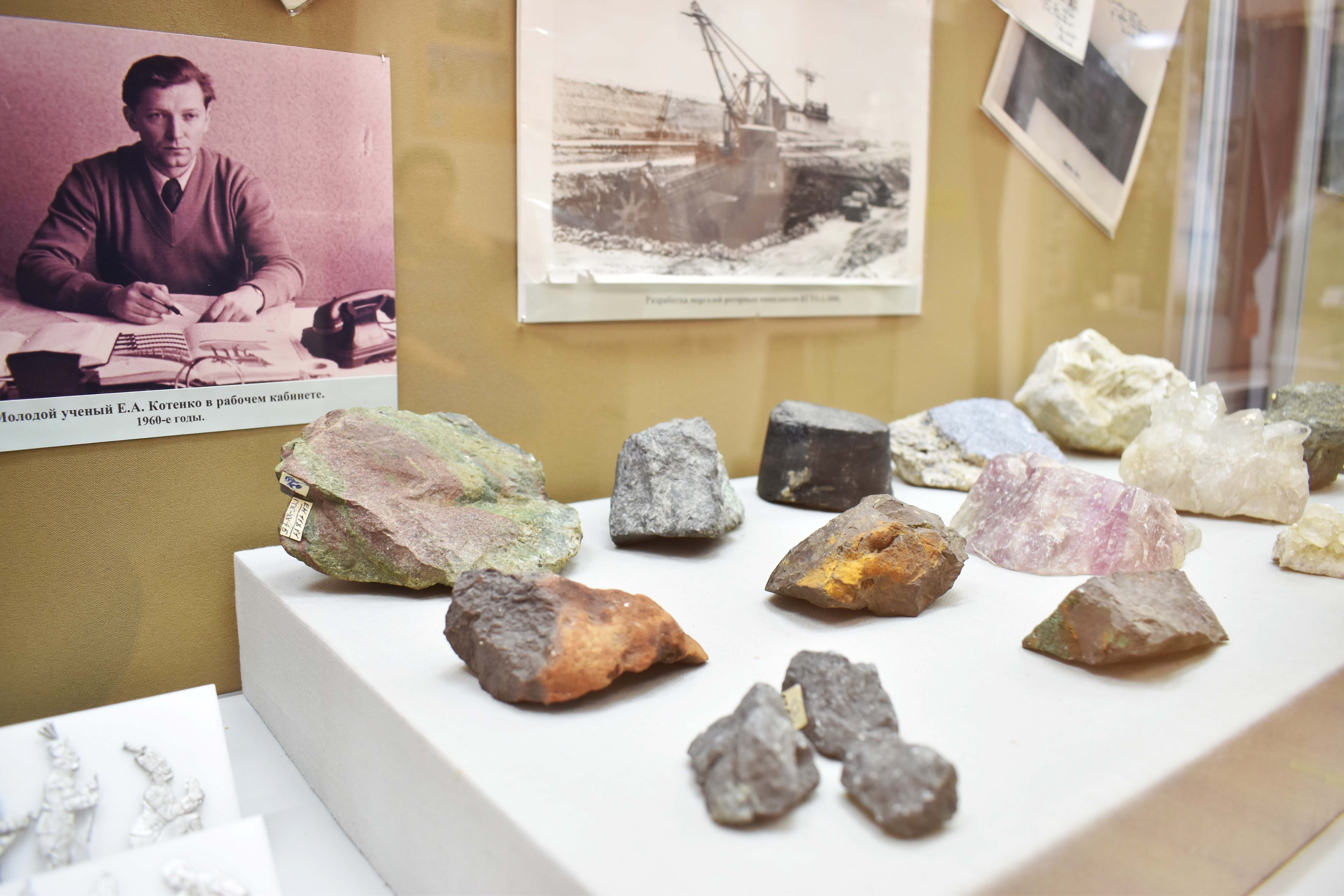 На выставке представлены научные труды и патенты Евгения Котенко, документы, личные вещи, коллекция минералов, литературные труды.
