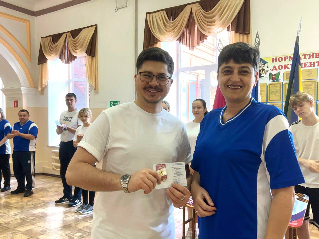 После успешного выполнения нормативов Всероссийского физкультурно-спортивного комплекса «Готов к труду и обороне» знаками ГТО и удостоверениями к ним были награждены учителя и учащиеся МБОУ СОШ № 2 имени Героя Советского Союза А.В.Ляпидевского г. Ейска.