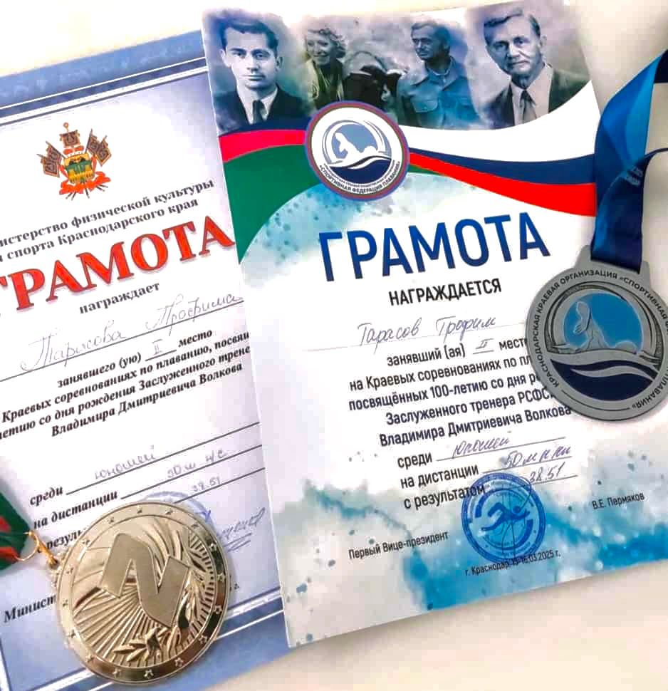 Достойные результаты показали пловцы спортивной школы «Олимп» Ейского района. Тарасов Трофим завоевал серебро на дистанции 50м на спине. Санина Полина стала бронзовой медалисткой на дистанции 50м баттерфляем.
