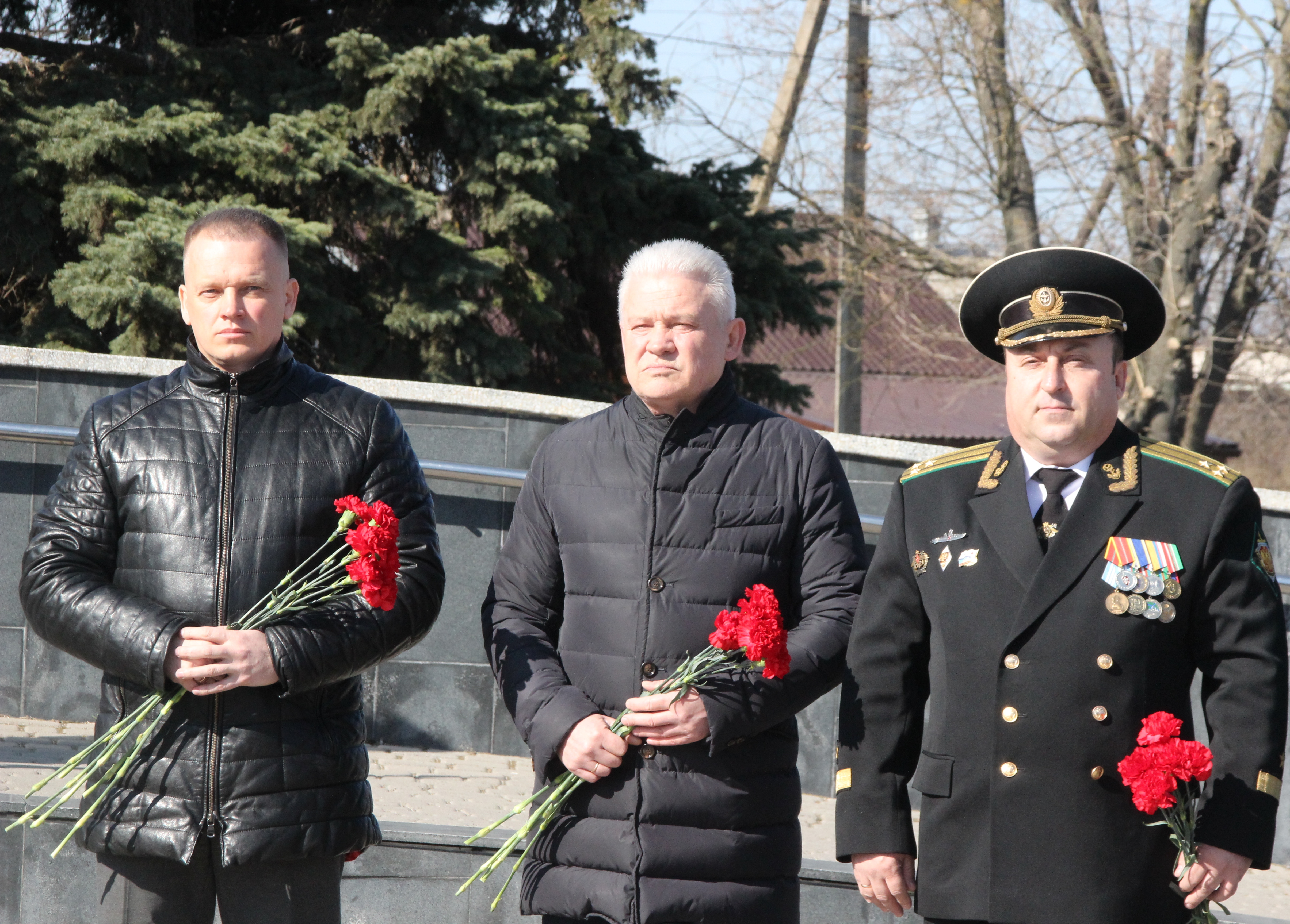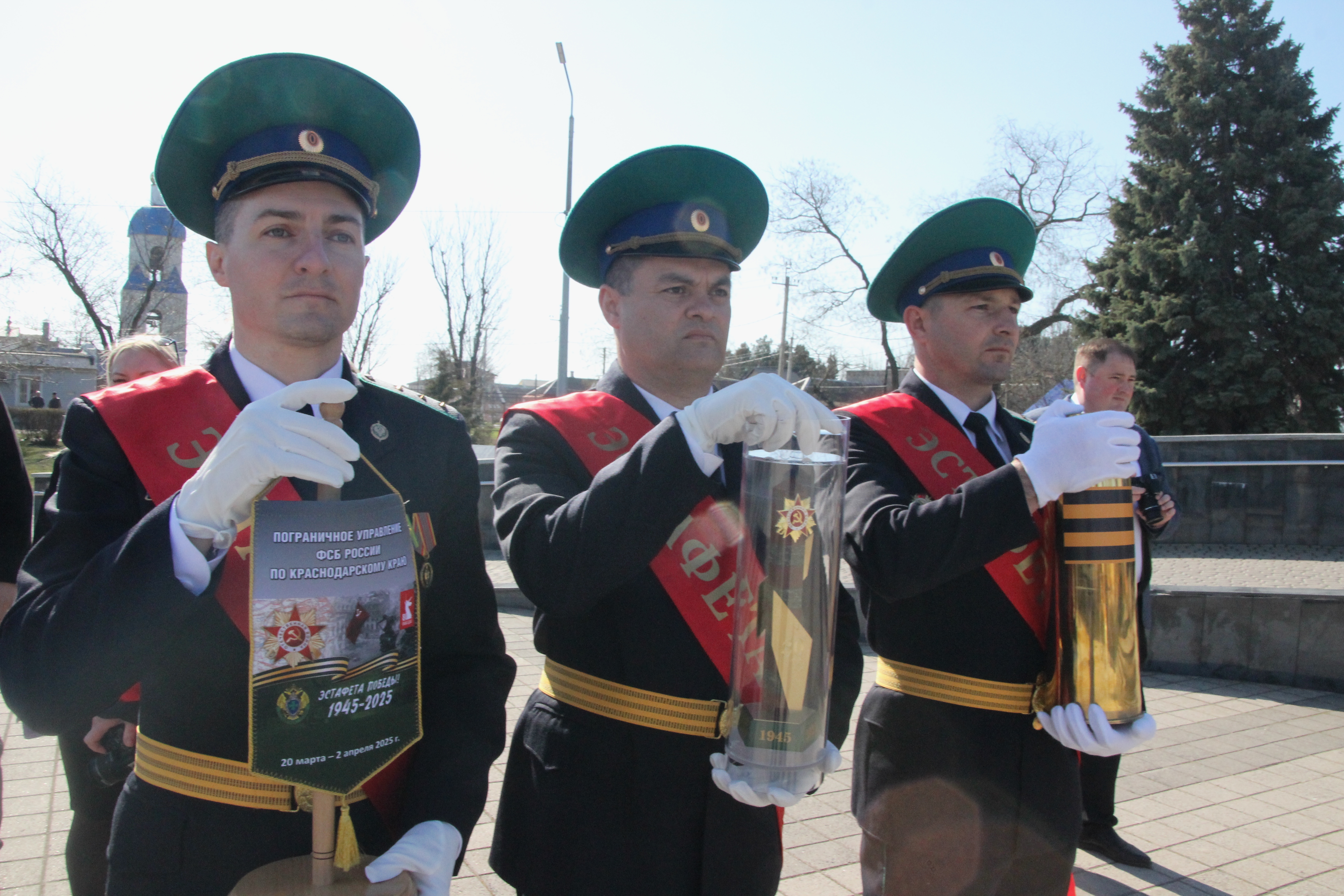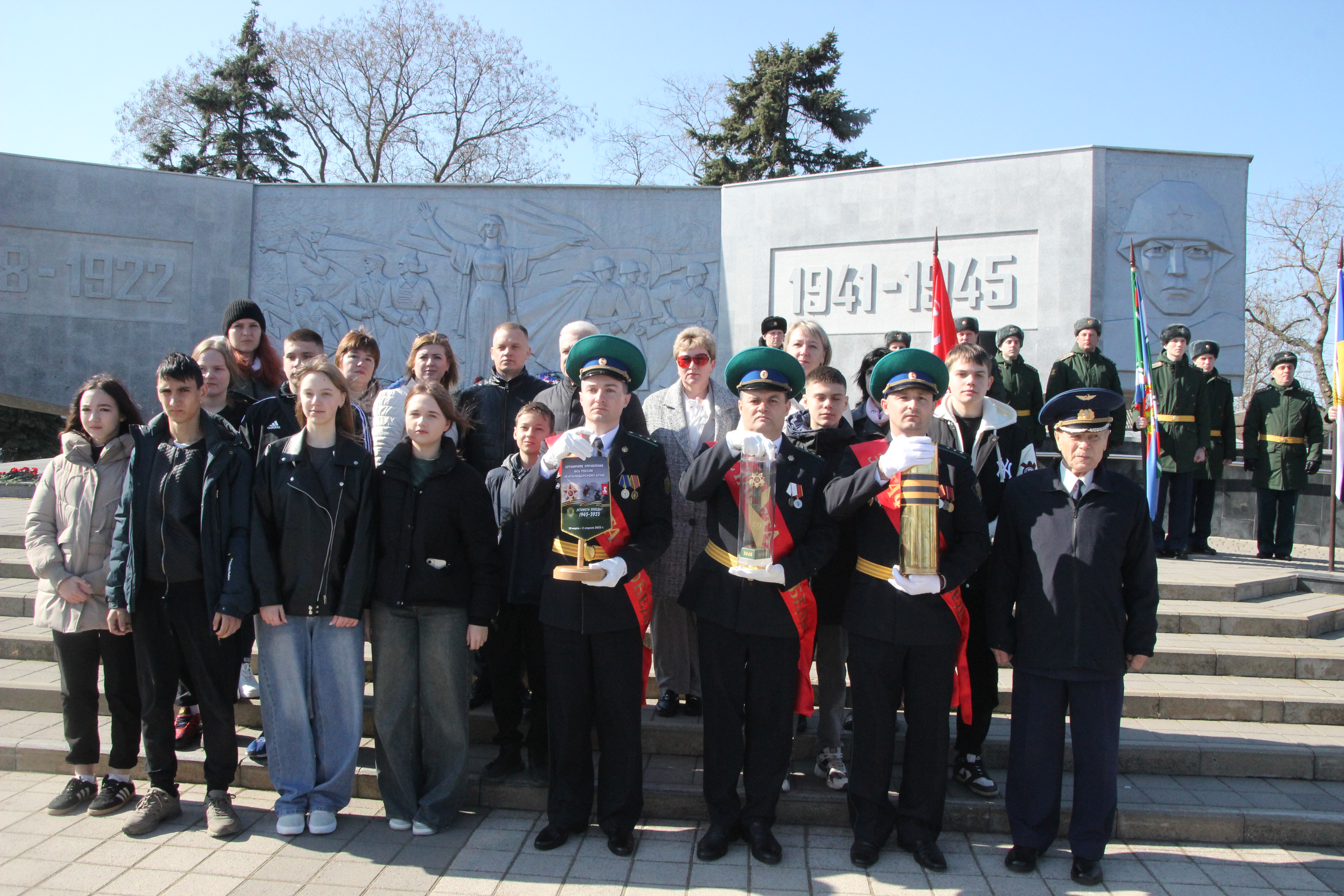 Встретив на площади Революции почетный караул с символами акции, ейчане возложили цветы и к памятному знаку у мемориального комплекса «Защитникам Ейска».