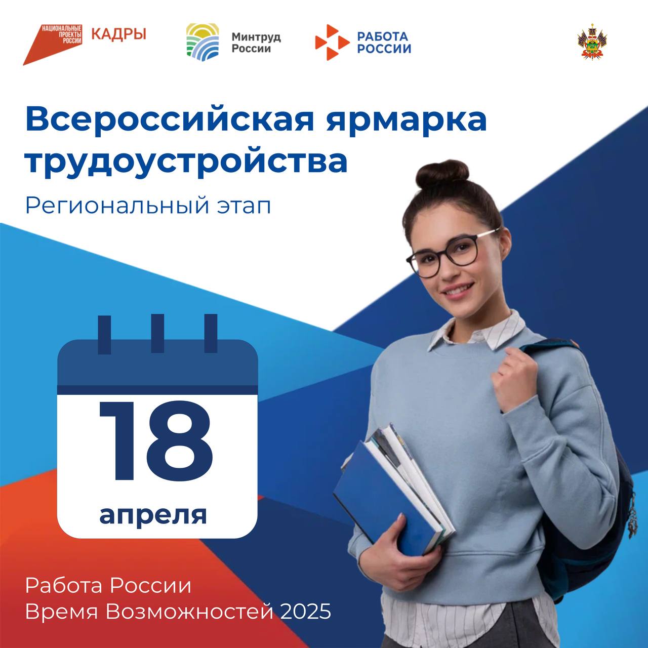18 апреля 2025 г. в г. Ейске в городском Дворце культуры ( ул. Свердлова, д. 73/1) пройдет региональный этап Всероссийской ярмарки трудоустройства «Работа России. Время возможностей»