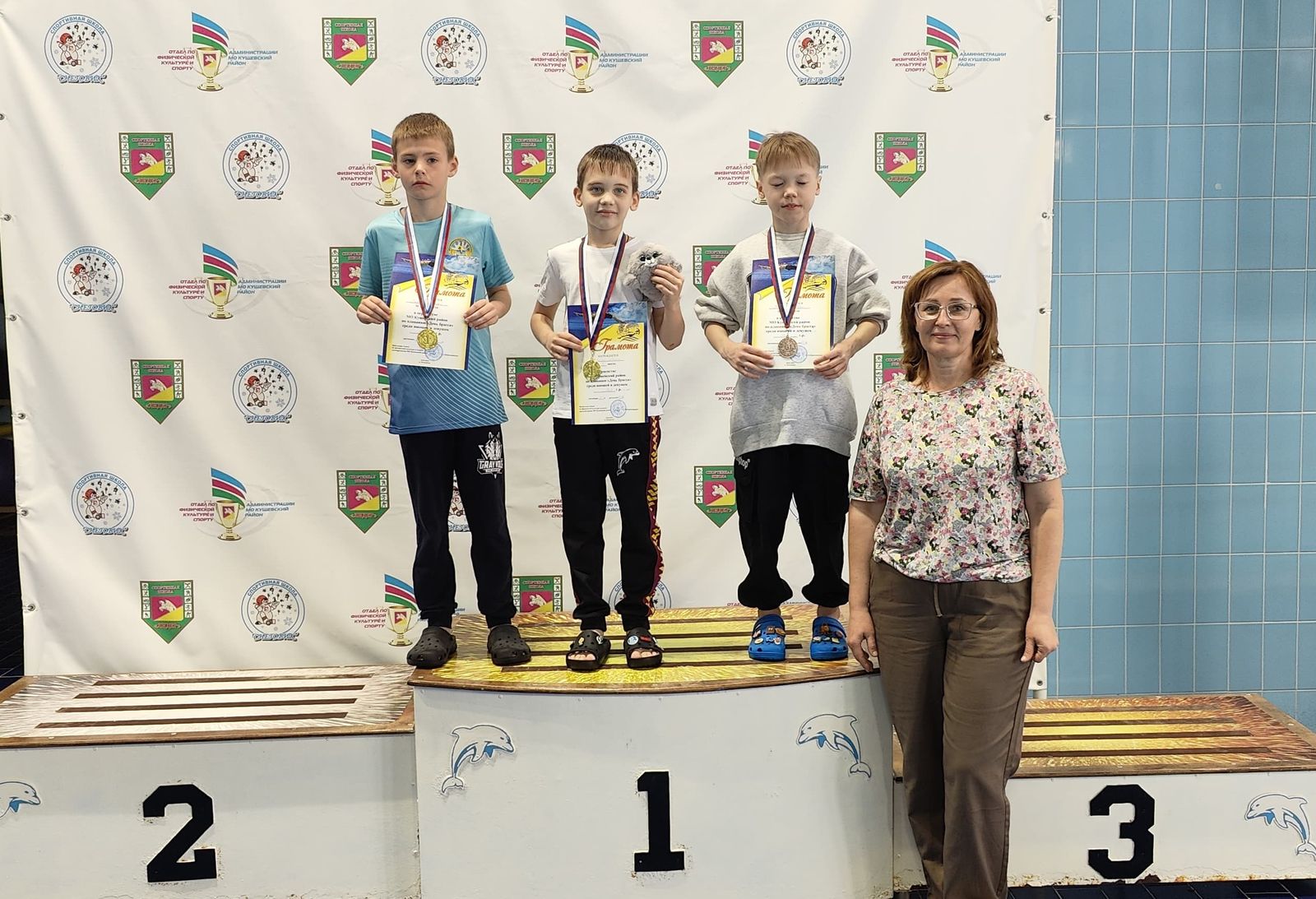 на дистанции 50 м брасс (мальчики) - 1 место Чернобаев Евгений и 3 место Надрин Савелий;