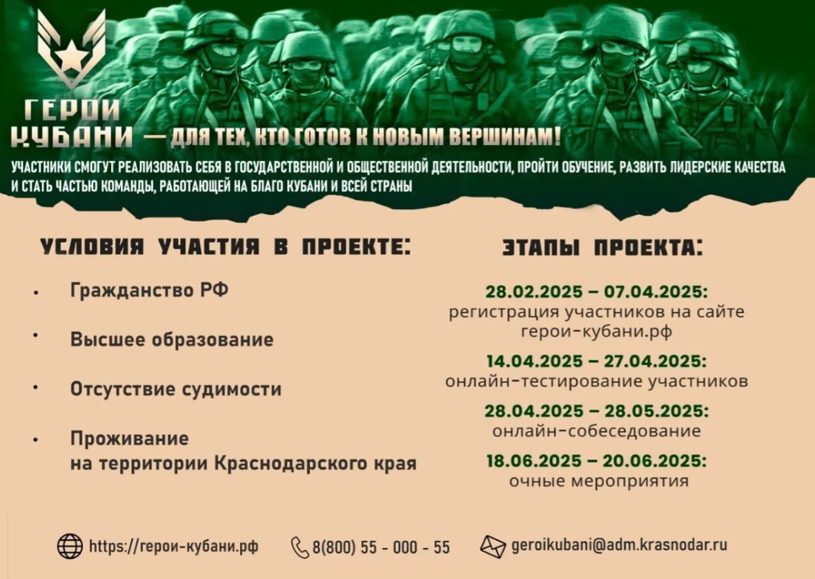 Проект "Герои Кубани" — это уникальная возможность усилить кадровый потенциал Кубани, рассказать историю пути наших защитников СВО, участников и ветеранов, а также реализовать свой потенциал в мирной жизни.