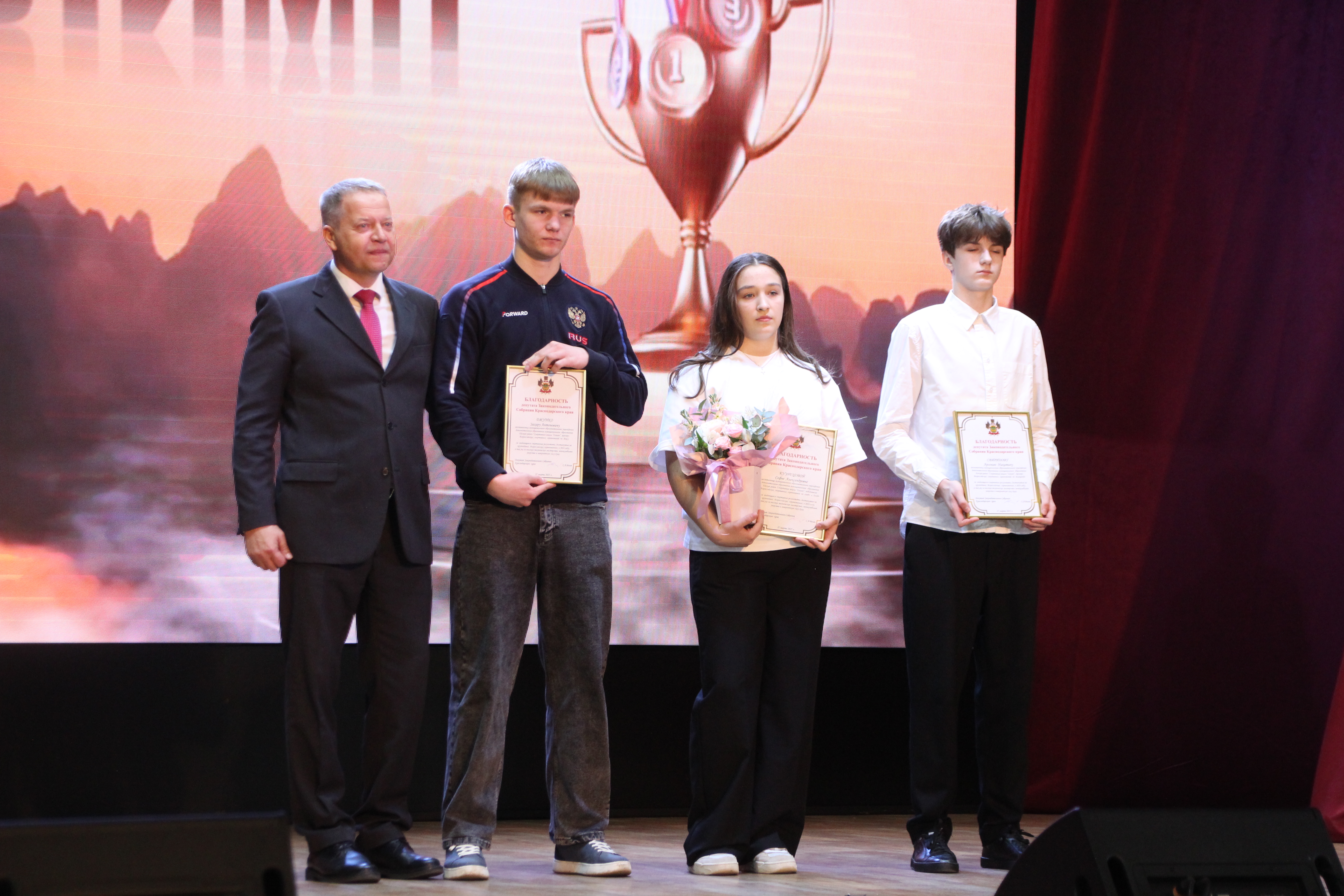 По инициативе главы района в концертном зале собрались юные спортсмены и их тренеры. Вместе с Романом Бубликом, депутатом ЗСК Сергеем Беланом, председателем Совета МО Ейский район Олегом Вяткиным, заместителем главы города Юрием Беланом они подвели итоги 2024 года.