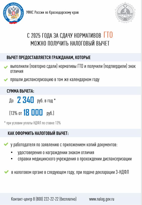 С 2025 года налогоплательщики могут воспользоваться вычетом за сдачу нормативов Всероссийского физкультурно-спортивного комплекса «Готов к труду и обороне» (ГТО).
