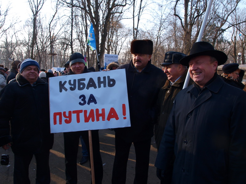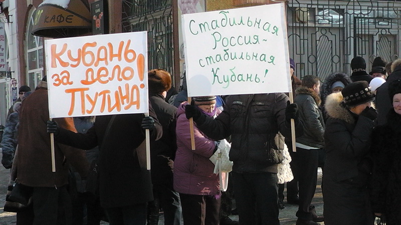 По плакатам можно было «собрать» всю карту Кубани – делегации представляли каждый район и город края. Мероприятие получилось не протокольным. Слово брали пенсионеры, учителя, спортсмены. Все они выступали за стабильность и дальнейшее развитие России, говорили, что для этого уже сделано и что необходимо сделать. В этот же день митинг в поддержку курса Владимира Путина состоялся и в городе Ейске. Митинг прошел под девизом «Мы за стабильность». Лидеры общественных и профсоюзных организаций, ветераны и молодежь со сцены говорили о необходимости продолжения начатых в стране инициатив и преобразований. Выступающие призвали поддержать курс Путина, направленный на развитие экономики, повышение уровня жизни и реализацию масштабных программ социально-экономического развития России и повышение качества жизни.