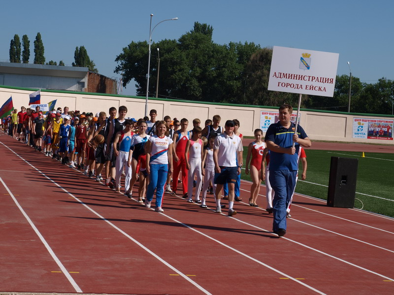 Большой спортивный праздник, посвященный Дню России, прошел сегодня на Центральном стадионе города. Открыл его парад спортивных делегаций района, возглавили который лучшие спортсмены Ейска. Многие из них включены в состав сборных Краснодарского края, Южного Федерального округа и России. Только за 5 месяцев этого года на соревнованиях различного уровня ейчане завоевали 75 золотых, 97 серебряных и 123 бронзовых медалей.