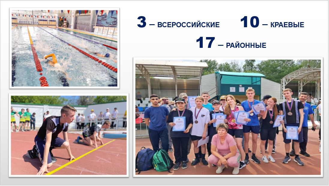 Воспитанники спортшколы «Виктория» приняли участие в 3 всероссийских, 10 краевых и в 17 районных и городских соревнованиях, привезли медали разного достоинства. 17 воспитанников спортшколы входят в сборную команду Краснодарского края, 12 ейчан с ограниченных возможностями здоровья имеют спортивные разряды.