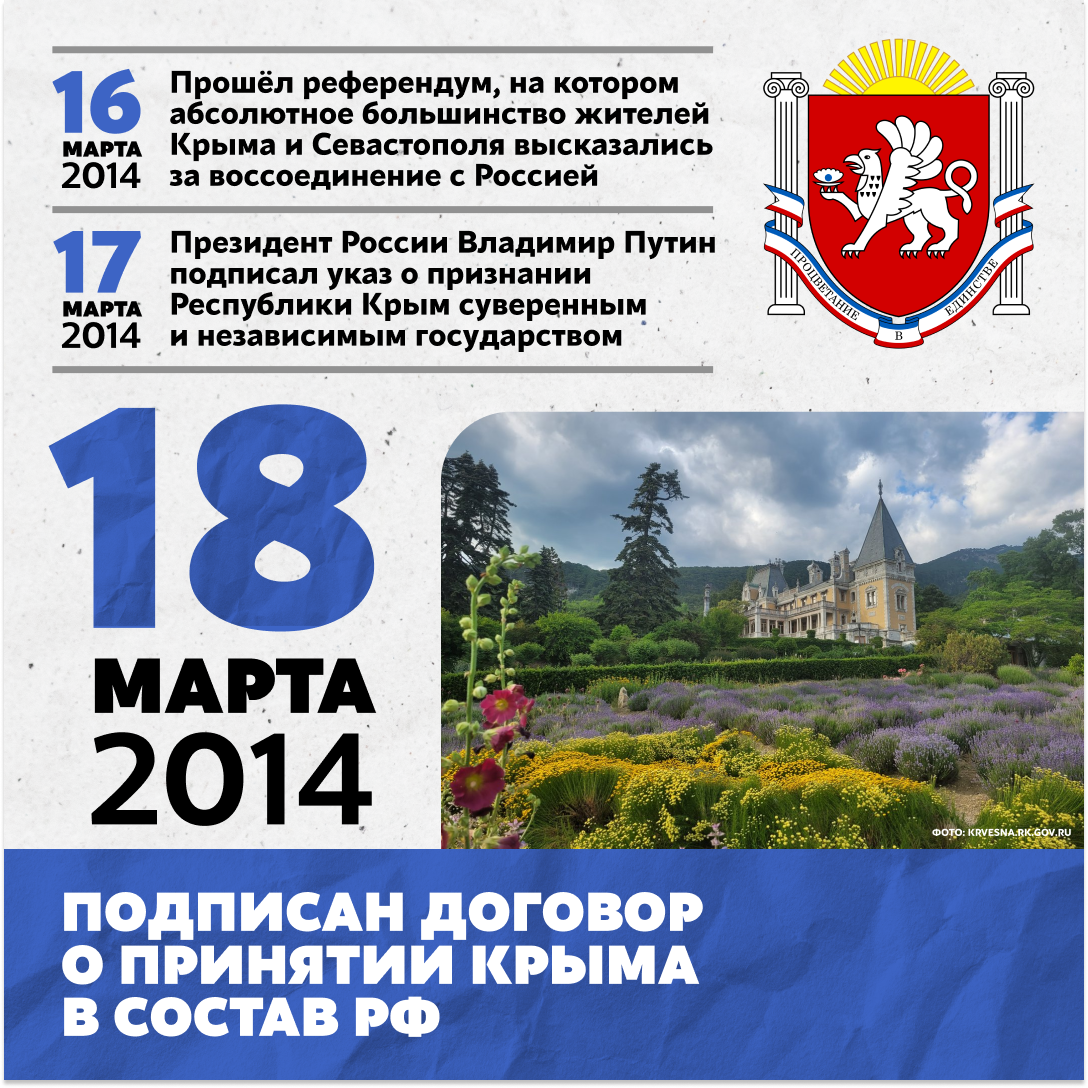 День воссоединения Крыма с Россией — важная историческая дата, которая отмечается ежегодно 18 марта начиная с 2014 года, когда Республика Крым и город-герой Севастополь официально вошли в состав Российской Федерации ????????
