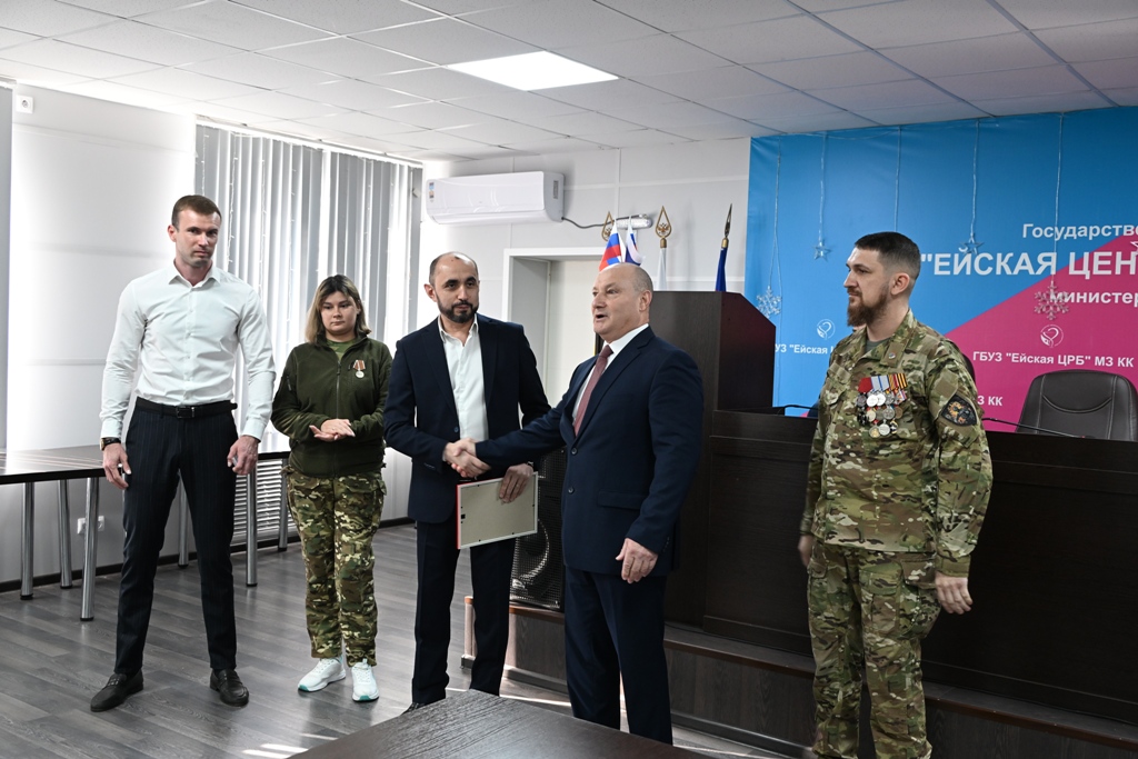 Сегодня заместитель главы Ейского района Сергей Загребельный наградил медалью "За содействие в СВО" главного врача Ейской центральной районной больницы Миграна Григоряна.