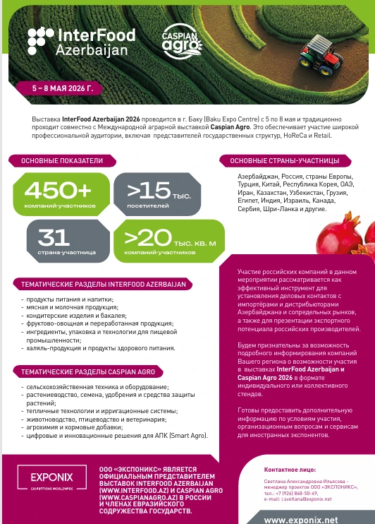 Мероприятия пройдут с 5 по 8 мая 2026г. в г. Баку и являются одними из крупнейших специализированных выставок продуктов питания и агропромышленного комплекса в Азербайджане и странах Каспийского региона.