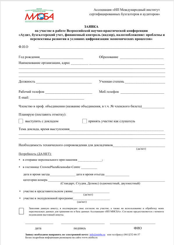 Уважаемые коллеги, при желании стать участником конференции необходимо до 1 апреля 2026 г. оформить и подать в оргкомитет заявку на участие на e-mail: info@misba.ru. По вопросам можно обращаться по тел/факс: 8(861)232-66-37, 232-60-37.