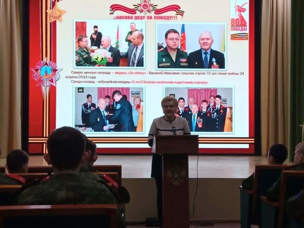 В актовом зале заместитель по воспитательной работе Юрий Блануца и педагог-организатор Елена Сербунова провели урок памяти. У корпуса с семьей Василия Ивановича сложились давние дружеские связи и на мероприятие приглашена его дочь – Алла Егорова, выступившая с благодарностью в адрес корпуса за сохранение памяти её отца и напутствием к будущим защитникам Отечества.