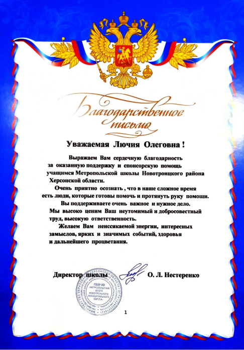 Слова признательности за поддержку от учеников сельской школы Херсонской области пришли в адрес депутата районного Совета Лючии Шулешовой