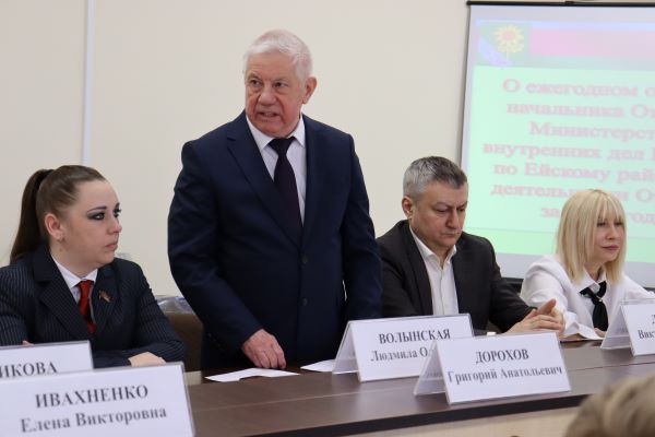 14 по повестке дня и два дополнительных вопроса рассмотрели депутаты на 42-й сессии Совета под председательством Олега Вяткина. Заседание началось с доклада начальника Отдела Министерства внутренних дел России по Ейскому району Александра Хотинова о деятельности Отдела за 2024 год. Охраной правопорядка и общественной безопасности ими обеспечена при проведении 180 публичных, культурно-зрелищных и религиозных мероприятий, в которых приняли участие порядка 50 тыс. человек. В течение всего года проводилась активная профилактическая работа, направленная на предупреждение правонарушений, для борьбы с наиболее тяжкими видами преступлений проведены операций: «Розыск», «Условник», «Правопорядок», «Внимание – дети» и другие.