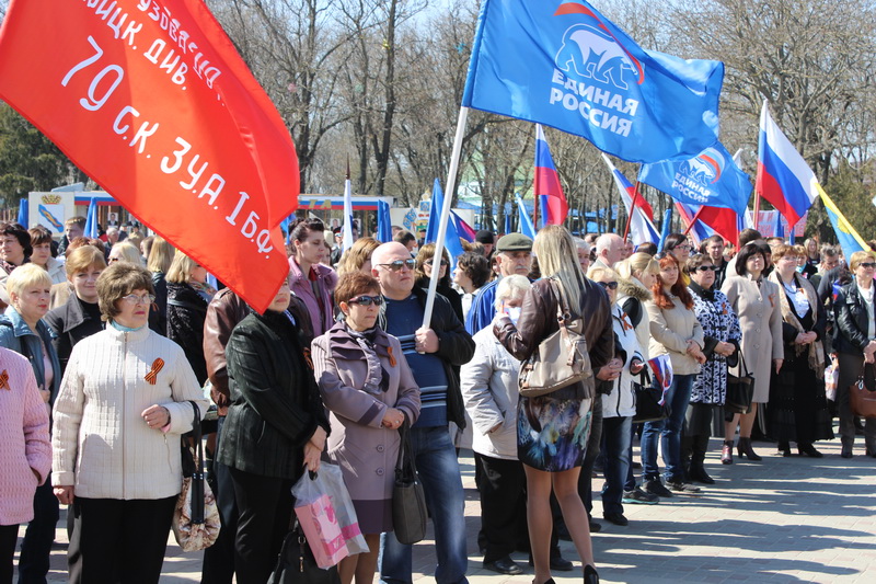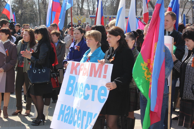 Сегодня в Ейске по инициативе Ейского местного отделения Партии «Единая Россия» прошёл митинг в поддержку жителей Крымского полуострова и города-героя Севастополя. Сотни ейчан - рядовые граждане, представители общественных организаций, политических партий, депутаты всех уровней, руководители района и города вышли на Театральную площадь на праздник единения с нашими родными в Украине. Каждый желающий мог подойти к микрофону и громко и открыто сказать о своём отношении к ситуации, сложившейся на братской земле.