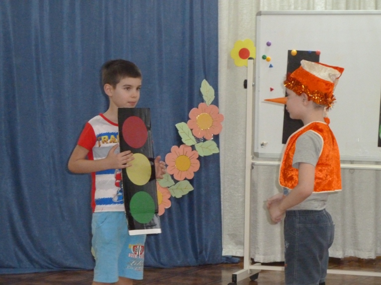 В ходе развлечения мальчишки и девчонки танцевали и пели песню «Светофор», отгадывали загадки, читали стихи про дорожные знаки, показывали сценку с участием Буратино, участвовали в эстафетах «Зажжем светофор», «Такси», «Проеду - не задену» и в играх на внимание «Разрешается – запрещается», «Собери знак». А в завершение развлечений дети посмотрели мультфильм «Азбука дорожной безопасности».