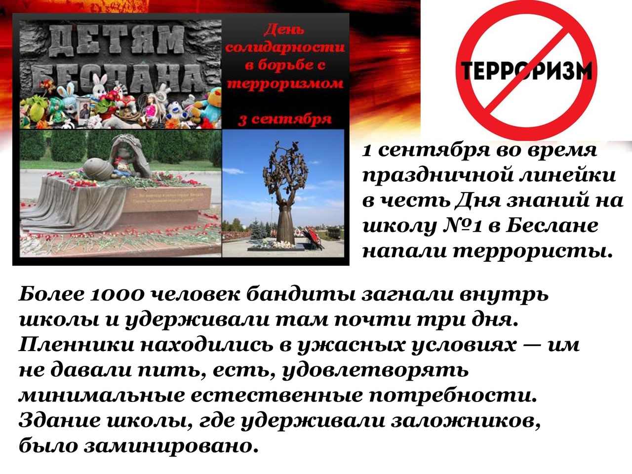 Сегодня, 3 сентября, в нашей стране отмечается День солидарности в борьбе с терроризмом. Дата выбрана не случайно, приурочена она к трагическим событиям, произошедшим в первых числах сентября 2004 года в г. Беслане Северной Осетии. С 1 по 3 сентября в результате жесточайшего террористического акта погибли более 300 человек, большей частью - женщины и дети.