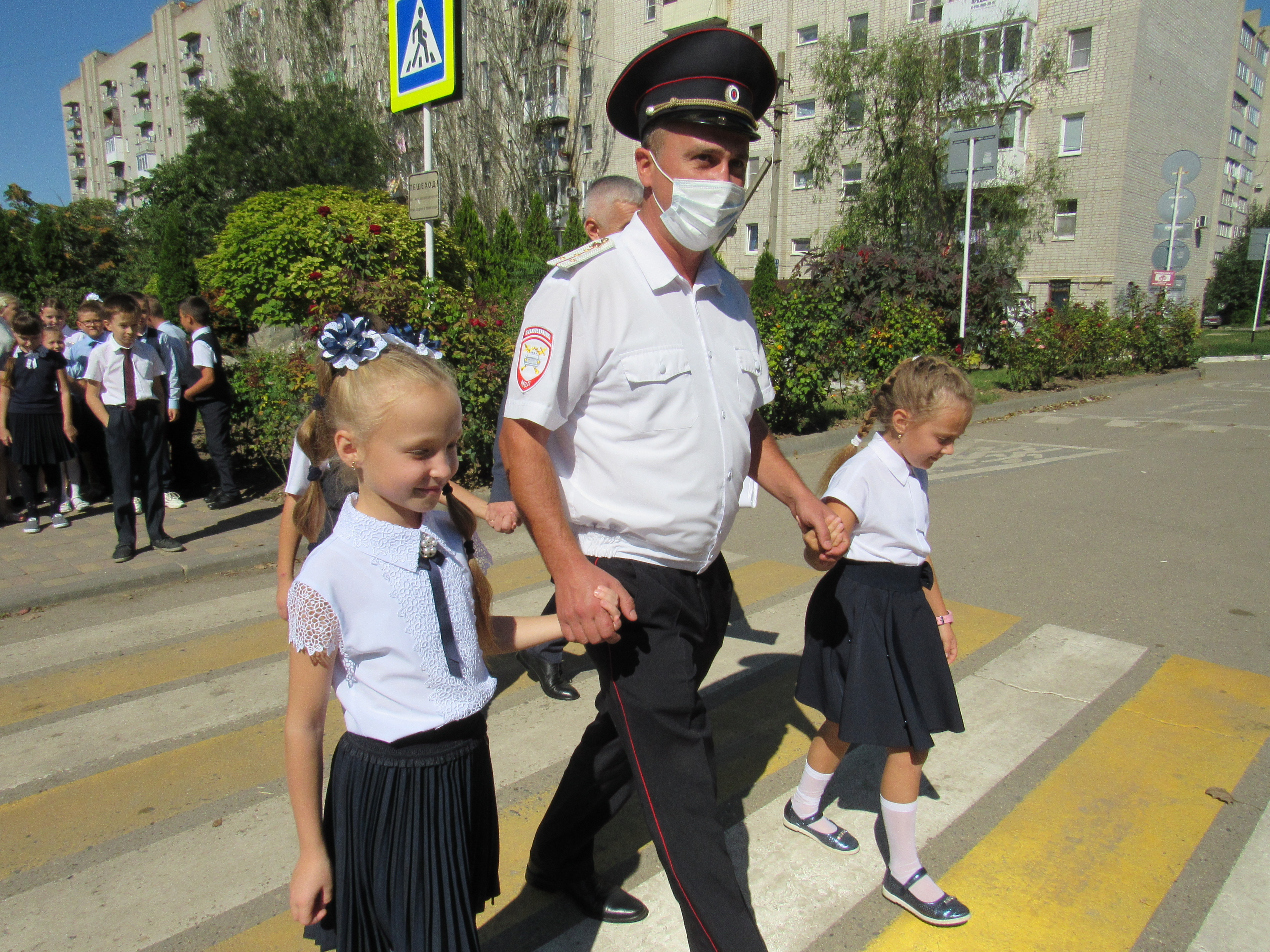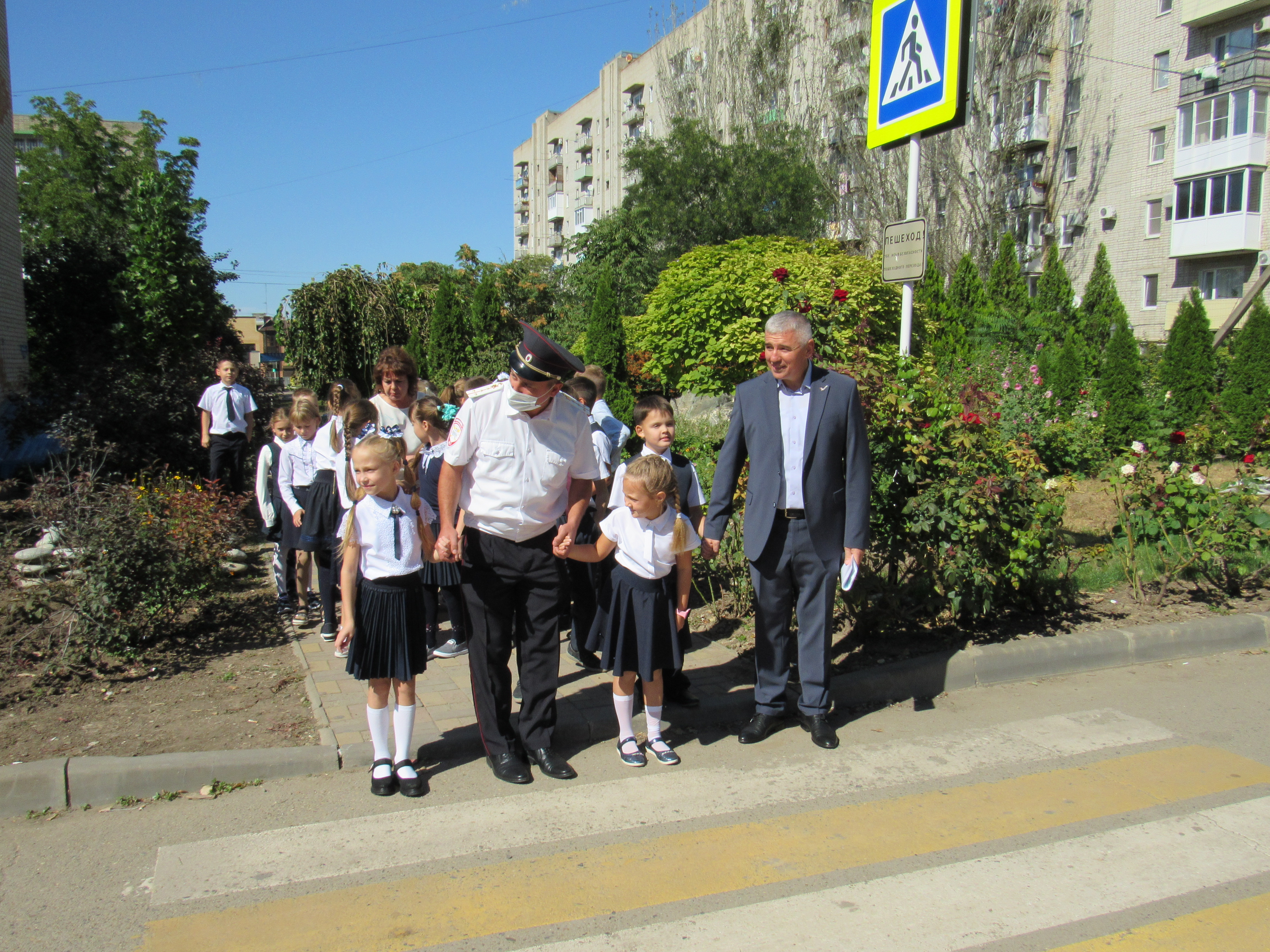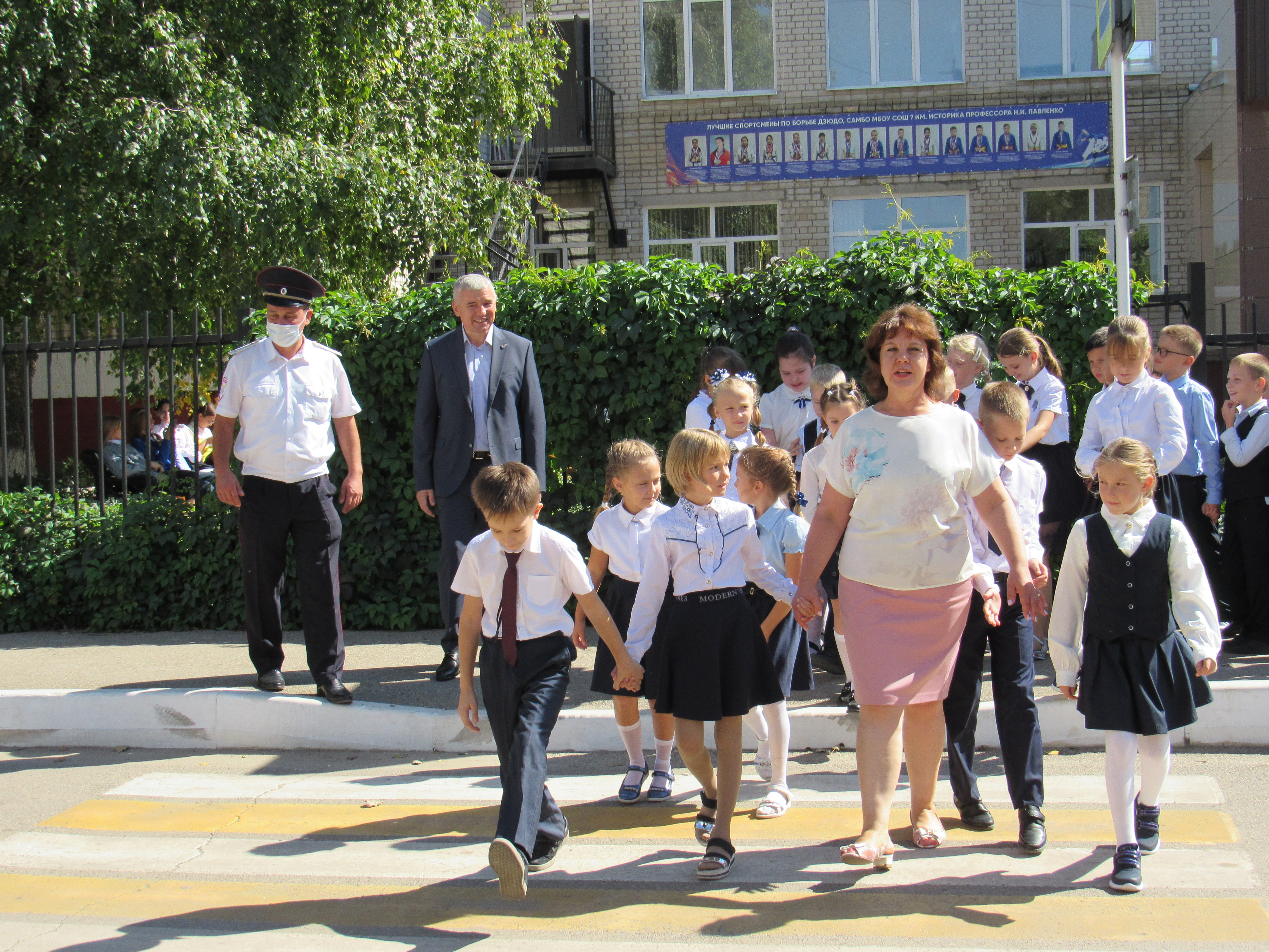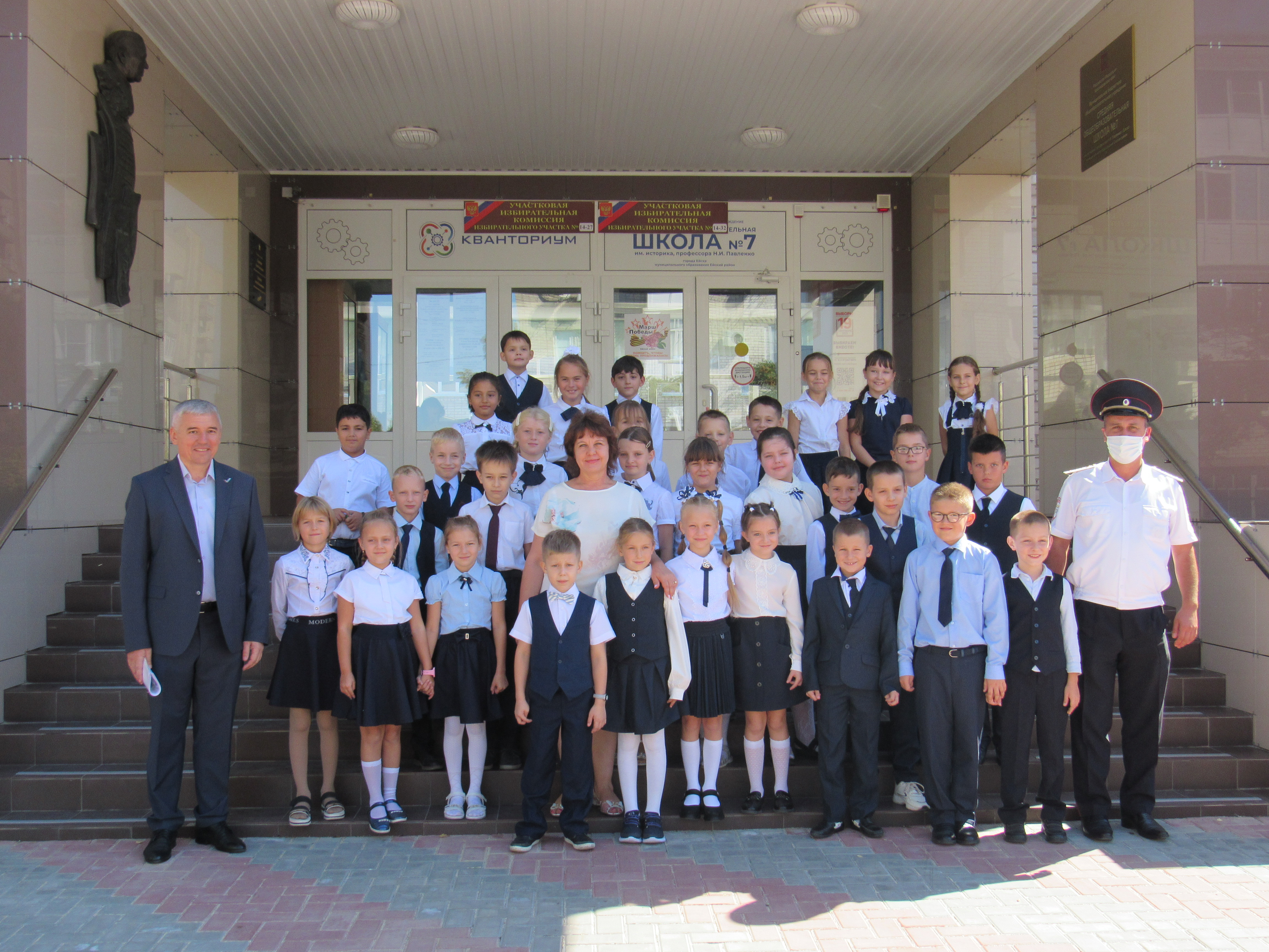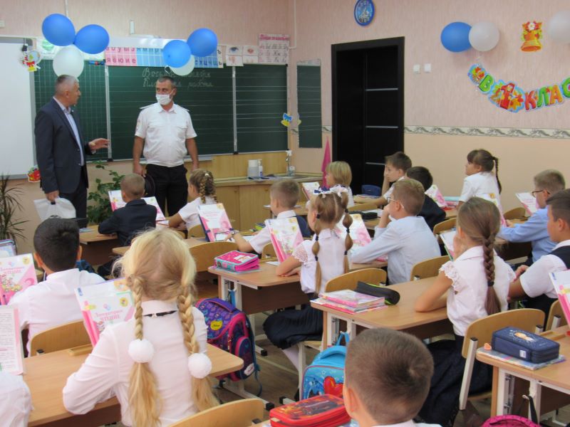 В самой большой школе № 7 г. Ейска урок безопасности дорожного движения провели заместитель начальника Госавтоинспекции Денис Нестеров, член краевого штаба ОНФ, депутат горсовета Валерий Черненко, специалист по связям со СМИ Отдела МВД России по Ейскому району Олеся Матяшова.