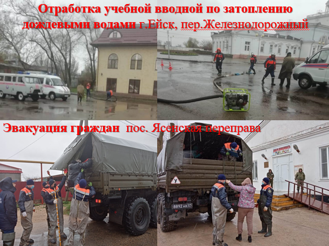 Основные усилия районного штаба руководства учением Ейского района сосредоточились на выполнении практических мероприятий по отработке краевой учебной вводной по затоплению территории вследствие нагонных явлений в пос. Ясенская Переправа Ейского района. В данных мероприятиях участвовало 87 человек и 21 ед. техники, 16 местных жителей для обозначения действий.