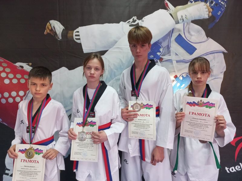 Шарафуллина Сабина и Жуков Андрей тренируются в СШ «Олимп», Настенко Даниил и Кунахова Анастасия в залах ФЕДЕРАЦИИ ТХЭКВОНДО ЕЙСКОГО РАЙОНА под руководством Сергея Шапкина.