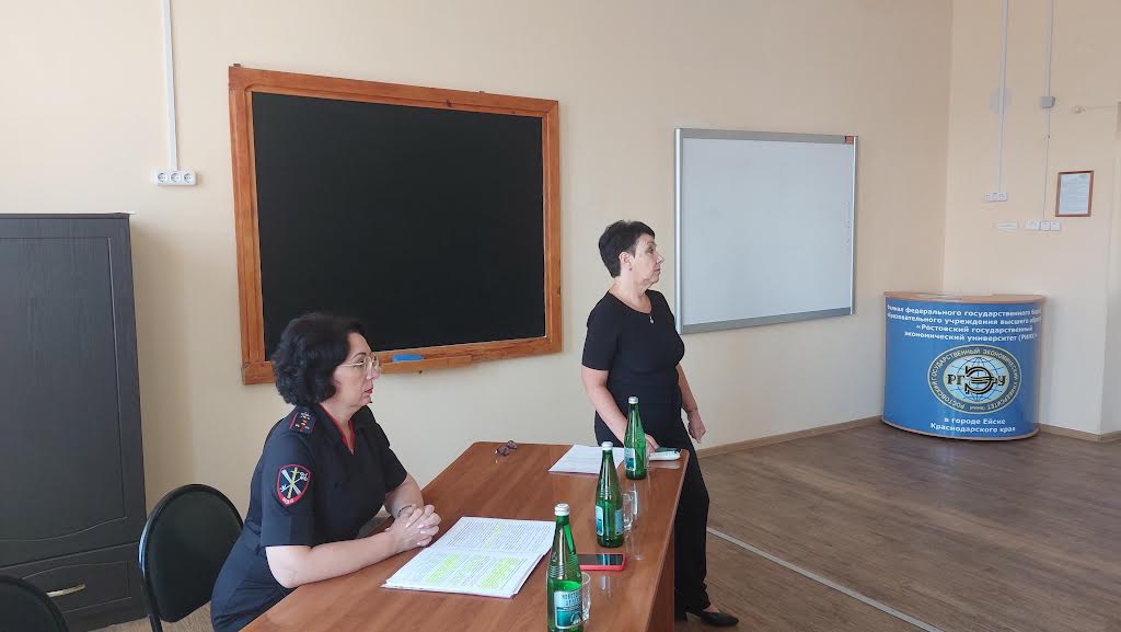 В целях формирования толерантного сознания у молодежи юрисконсульт Отдела МВД России по Ейскому району капитан внутренней службы Алевтина Ивченко совместно с представителем Общественного Совета Александрой Сотниковой провели мероприятие «У террора нет будущего» со студентами Ейского филиала «Ростовского государственного экономического университета».