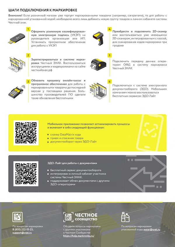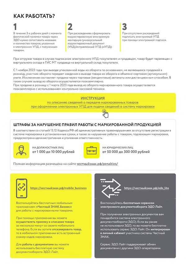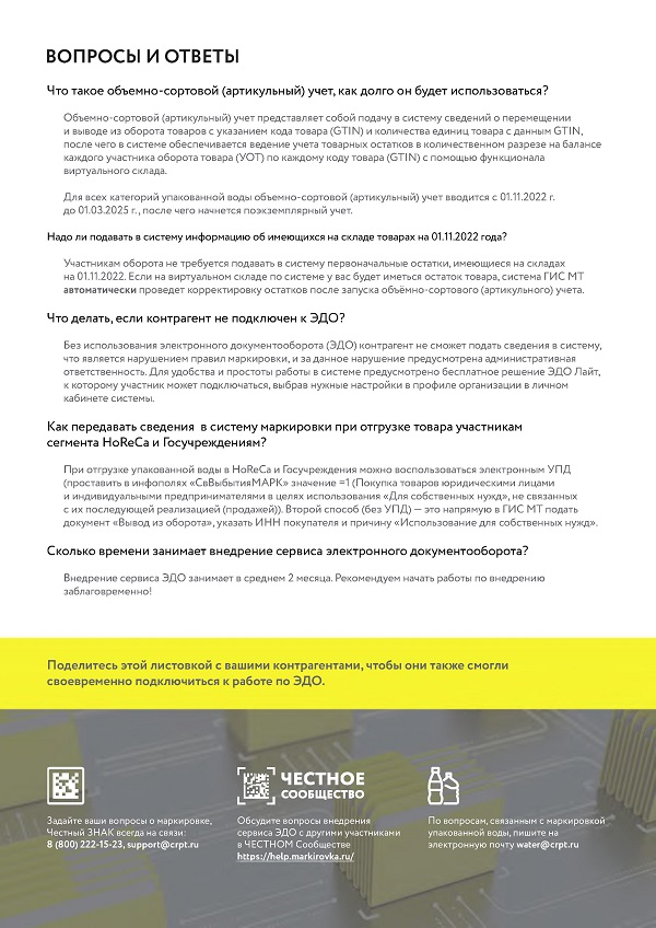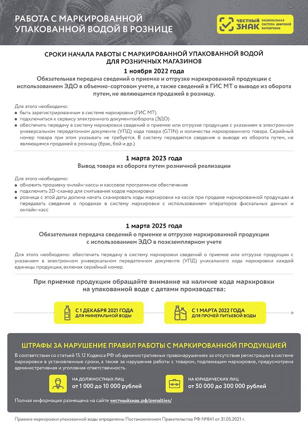 Постановлением Правительства Российской Федерации от 31 мая 2021 № 841 «Об утверждении Правил маркировки упакованной воды средствами идентификации и особенностях внедрения государственной информационной системы мониторинга за оборотом товаров, подлежащих обязательной маркировке средствами идентификации, в отношении упакованной воды», с 1 ноября 2022 г. вступают в силу требования о передаче в информационную систему маркировки сведений об обороте упакованной воды в разрезе количества и кода товара, передаваемых в составе универсального передаточного документа посредством электронного документооборота(ЭДО), а также сведения о выводе из оборота путем, не являющимся продажей в розницу.