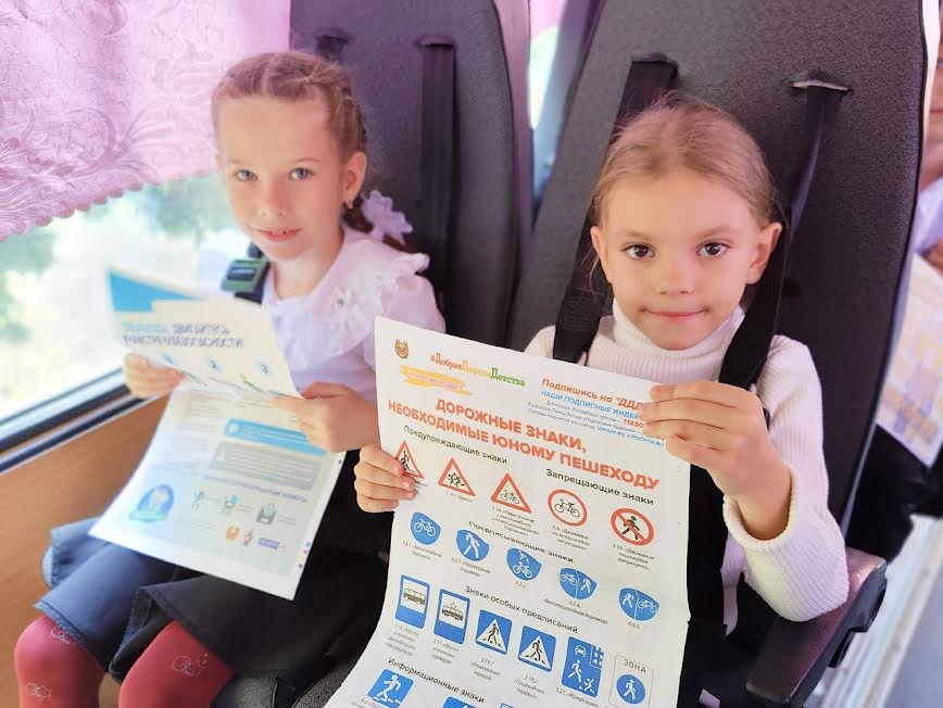 Инспектор рассказала детям о правилах поведения в салоне автобуса, разъяснила, для чего служат ремни безопасности. Напомнила об основных правилах безопасного поведения на дороге и дорожных знаках. Объяснила, как правильно оценивать обстановку на дорогах и улицах во время движения по ним. Дети вспомнили значения цветов светофора и разобрали особенности ПДД для велосипедистов. Также инспектор рассказала и о необходимости ношения на одежде световозвращающих элементов.