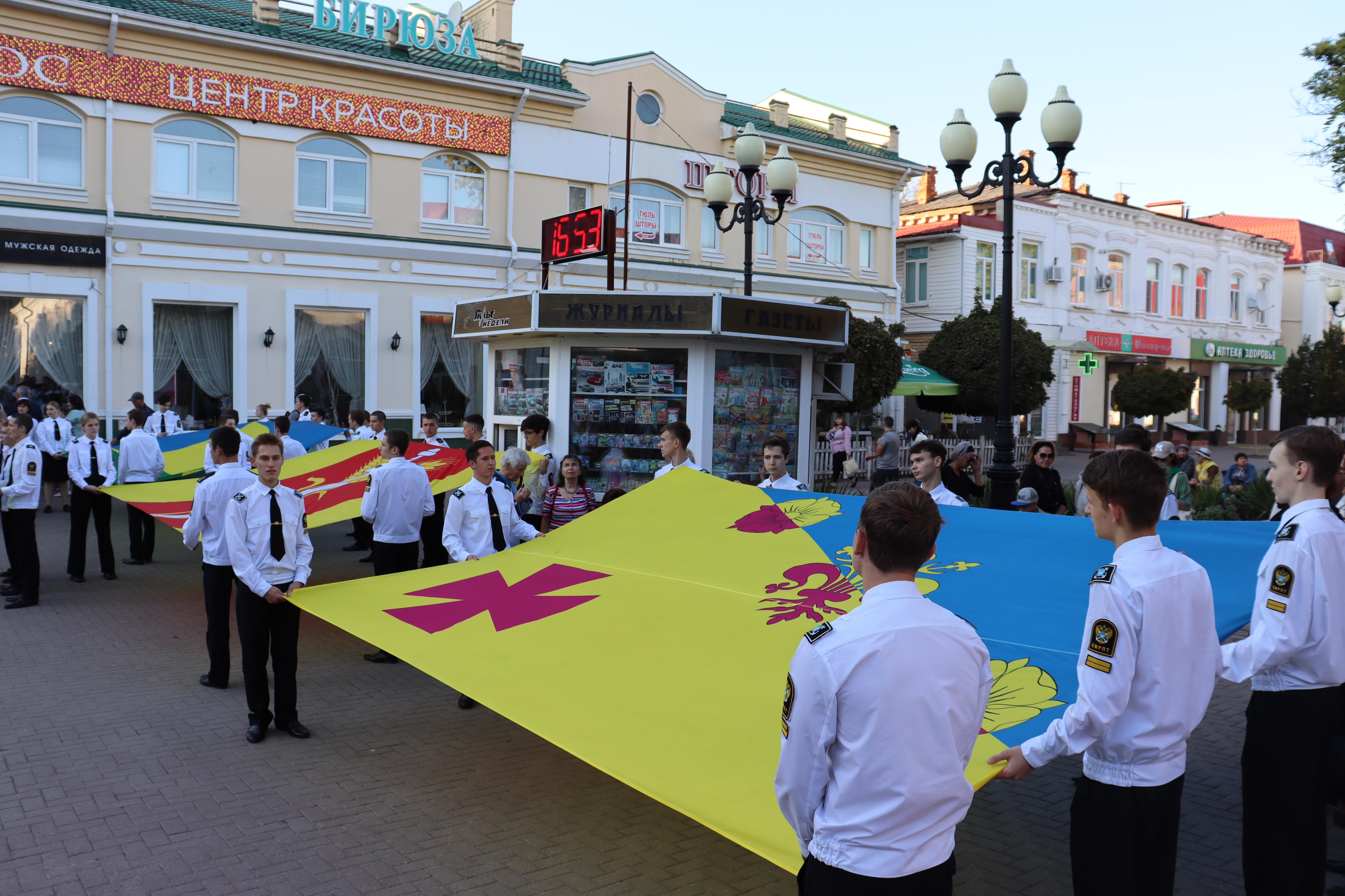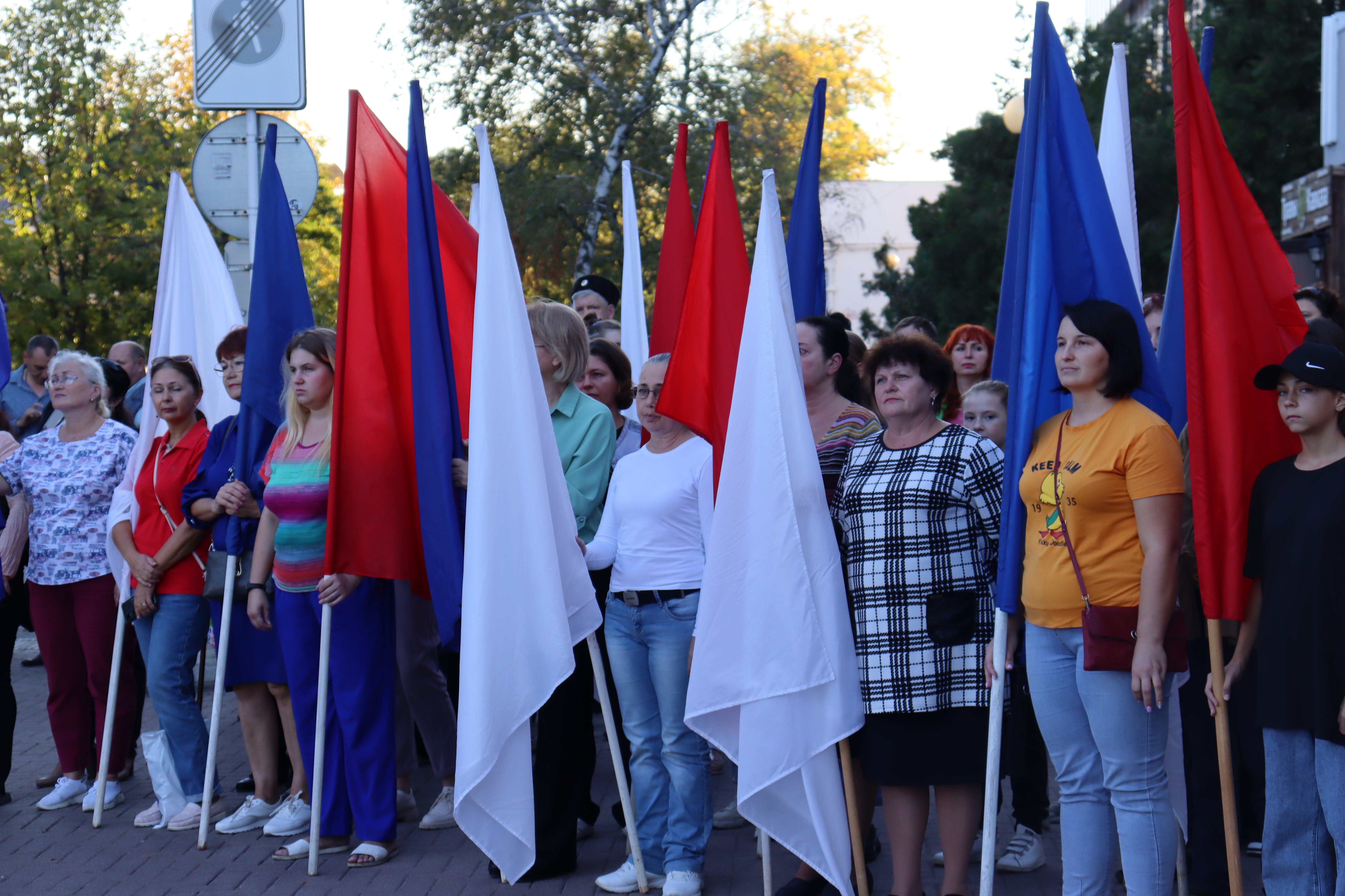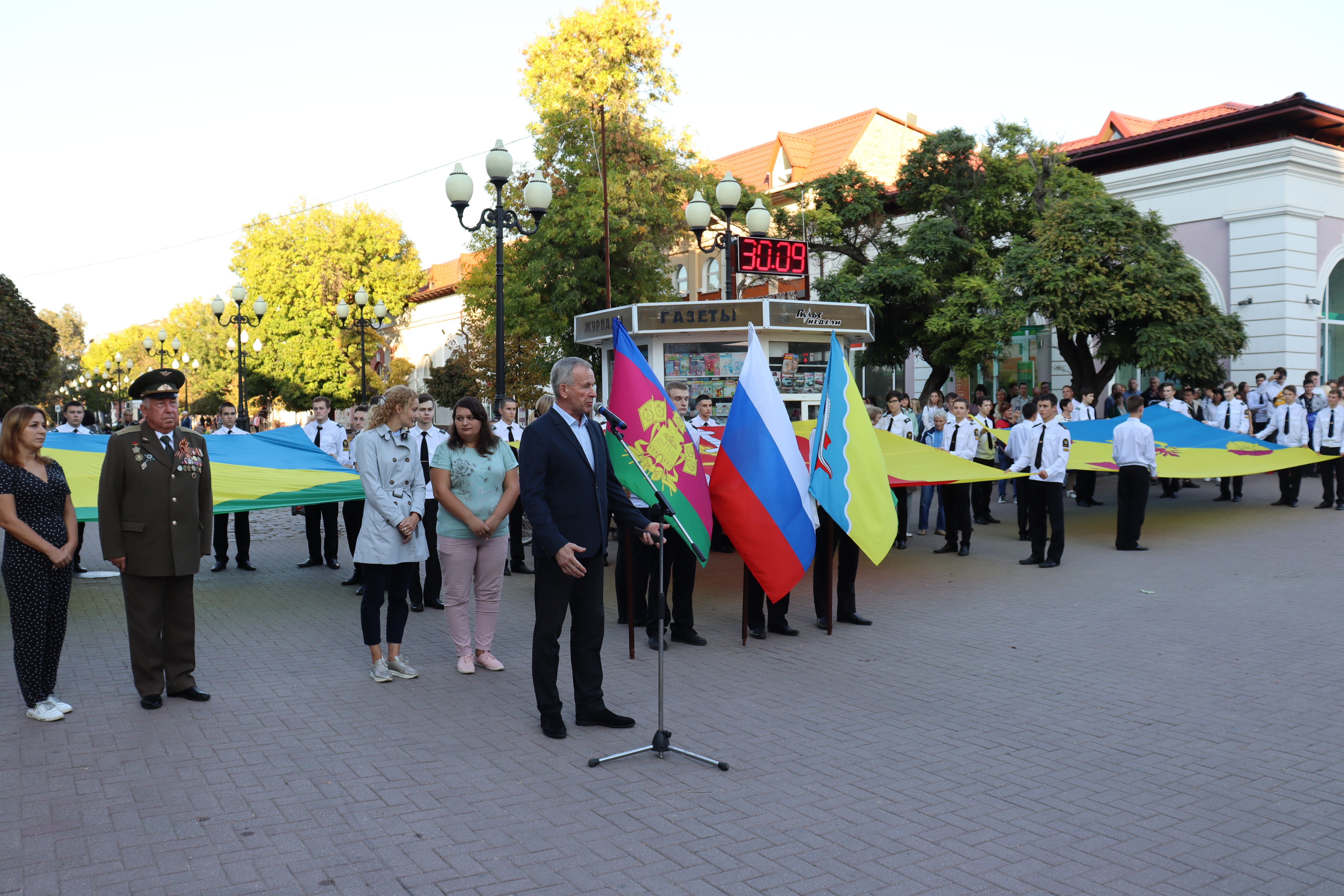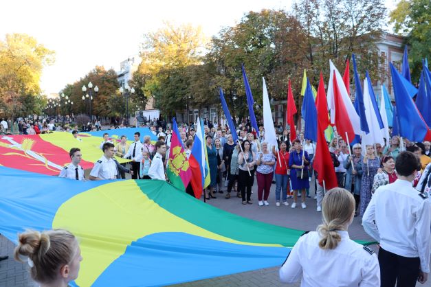Сегодня на пересечение улиц Ленина и Свердлова вышли жители и гости города. Здесь были развернуты флаги поселений, развивался триколор нашей страны, флаги Кубани и муниципалитета в руках присутствующих. К жителям и гостям Ейского района обратился заместитель главы муниципалитета Юрий Ковров.