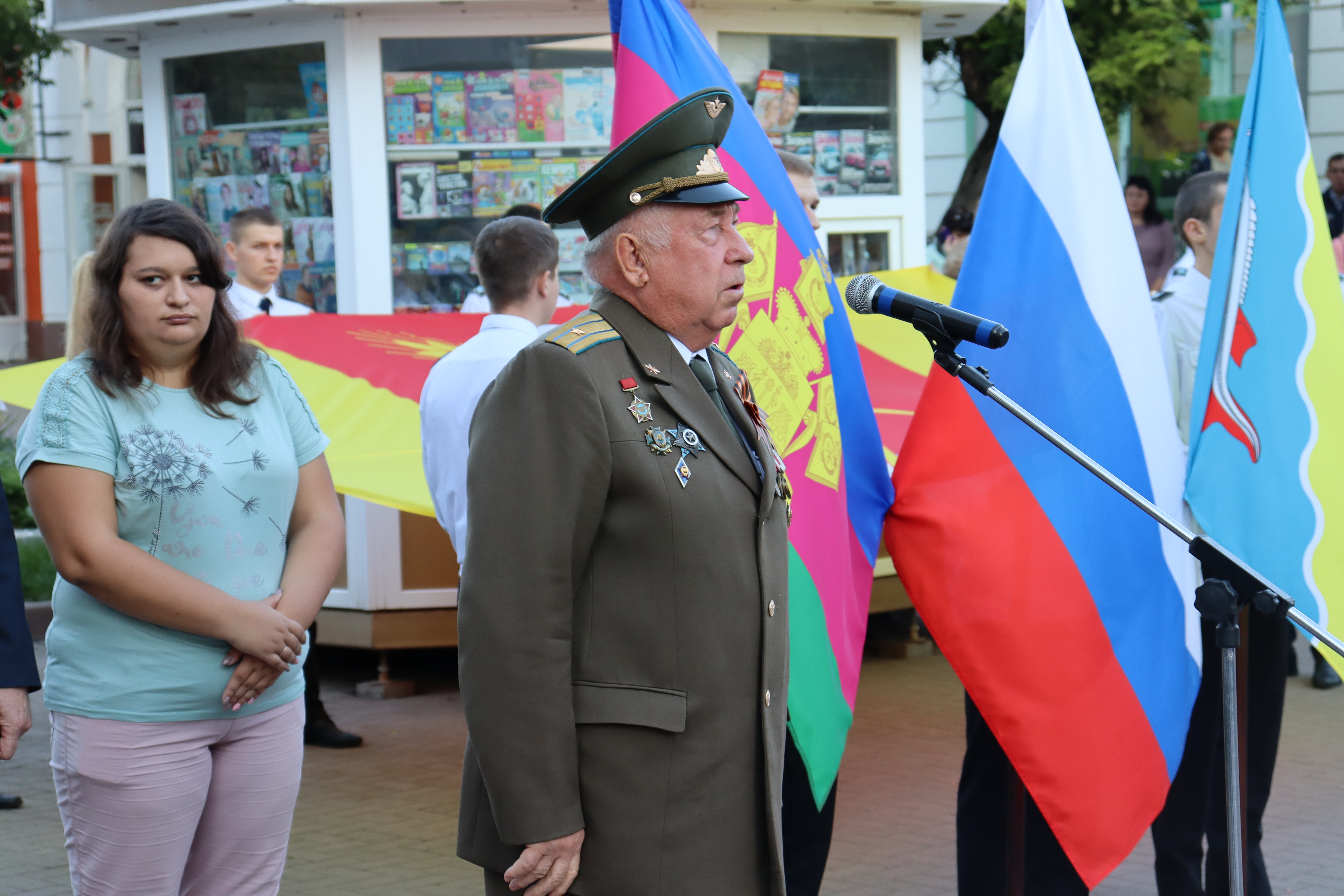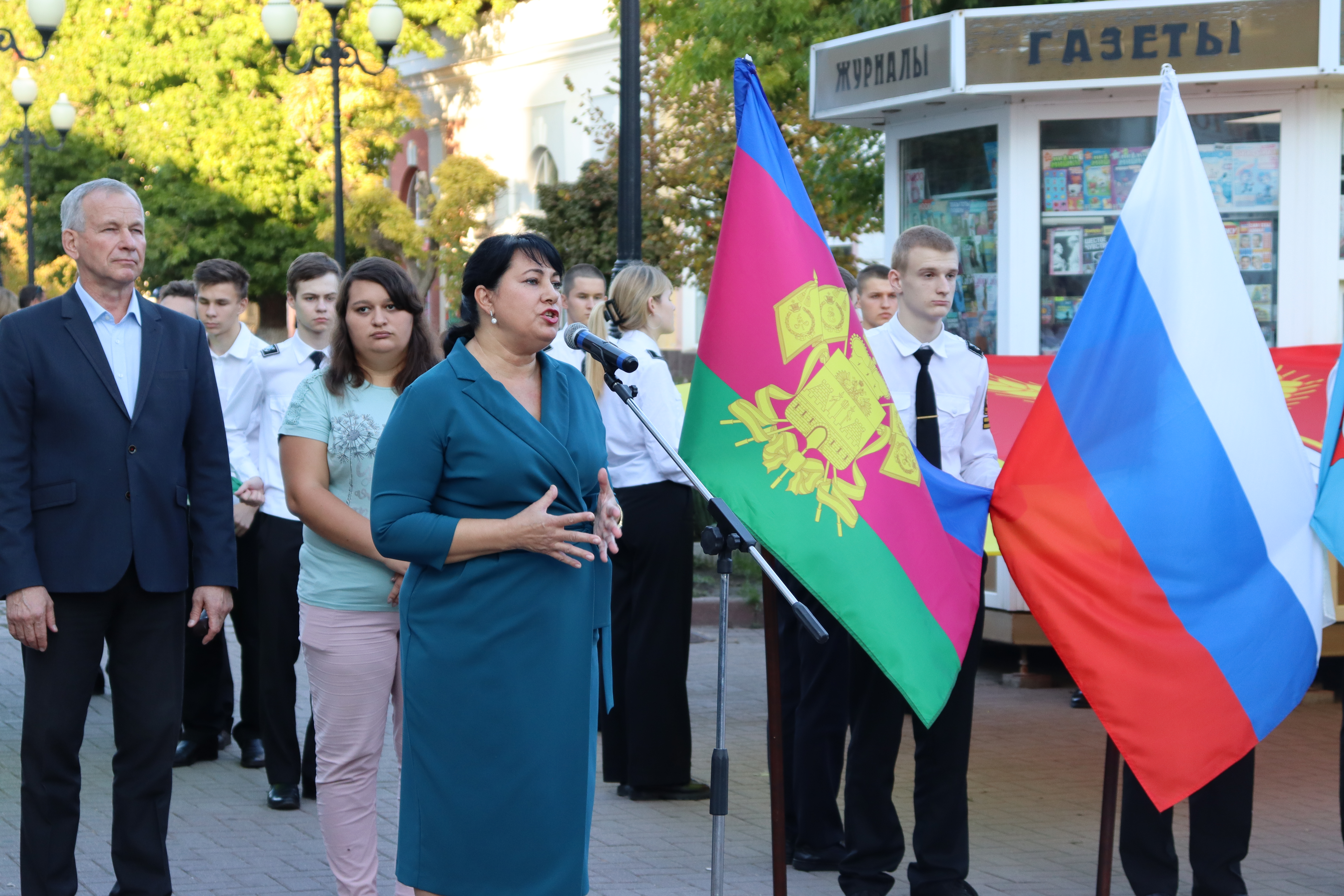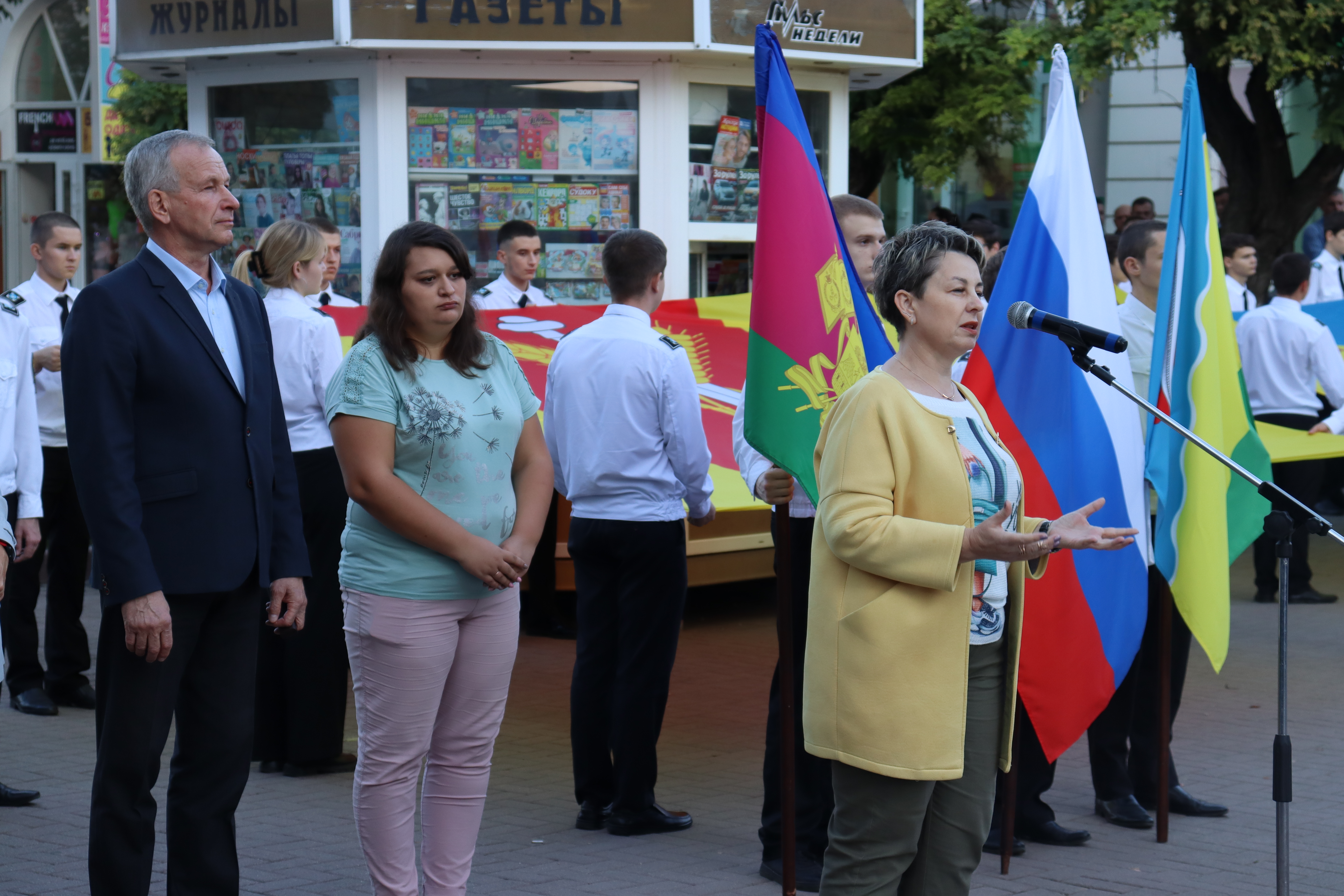 Сегодня на пересечение улиц Ленина и Свердлова вышли жители и гости города. Здесь были развернуты флаги поселений, развивался триколор нашей страны, флаги Кубани и муниципалитета в руках присутствующих. К жителям и гостям Ейского района обратился заместитель главы муниципалитета Юрий Ковров.