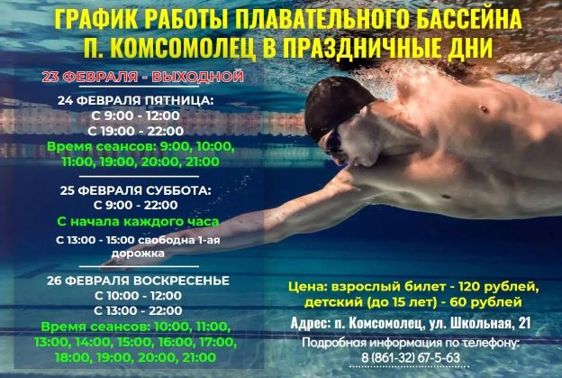 Цена взрослого билета - 120 рублей, стоимость детского билета (до 15 лет) - 60 рублей. Ждём вас по адресу: п. Комсомолец, ул. Школьная,21. По вопросам посещения спортивного комплекса с плавательным бассейном обращаться по телефону: 8 (86132) 67-5-63.