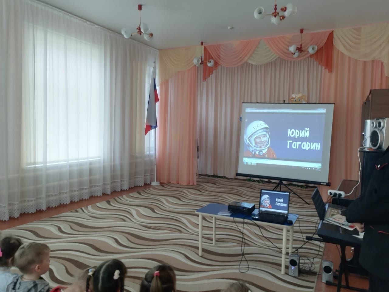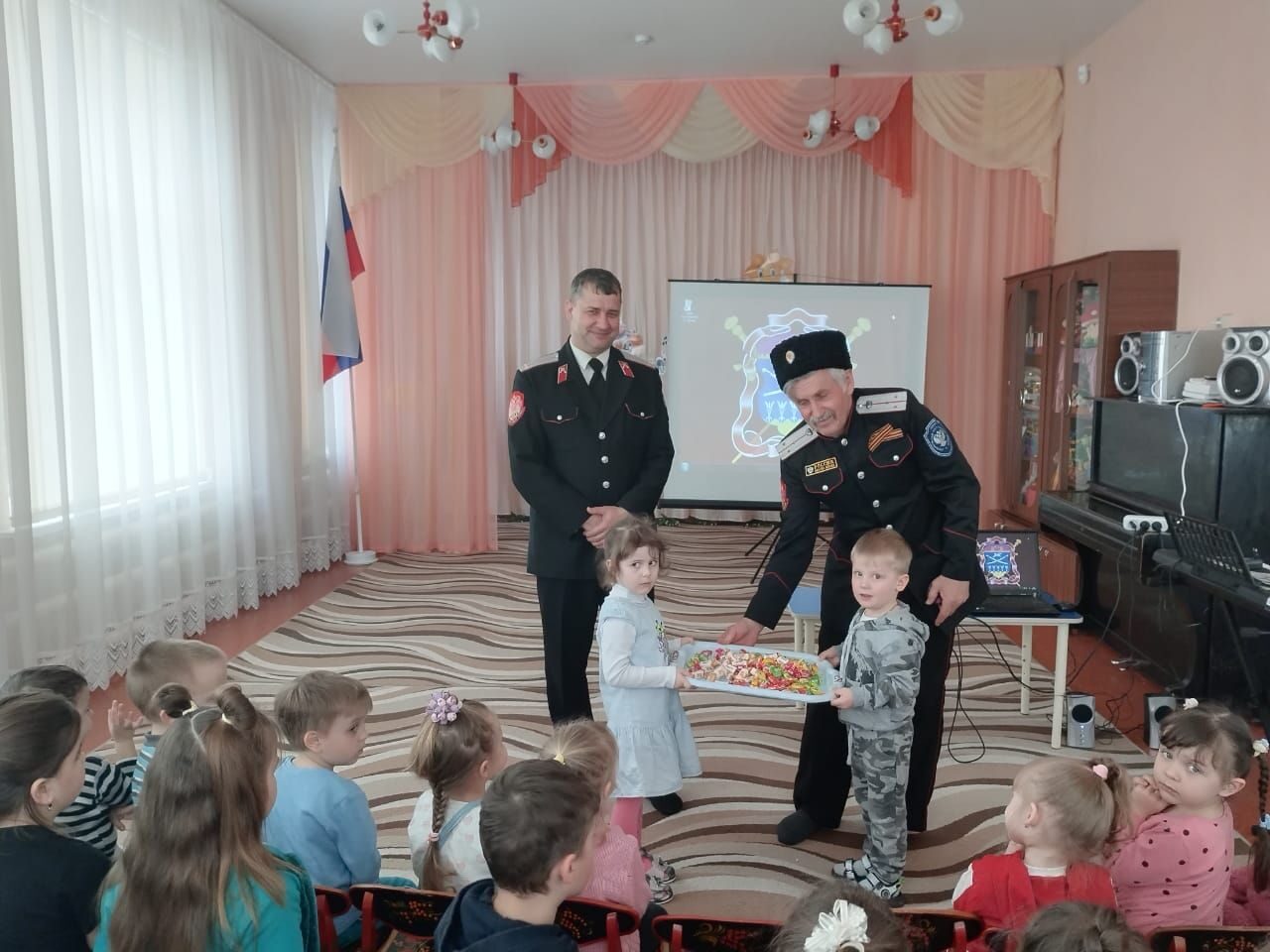 Вместе с детворой казаки посмотрели и обсудили мультипликационные фильмы "Кто такой Юрий Гагарин" и "День Космонавтики", а завершили встречу поощрительным вручением сладких гостинцев дошколятам за активное участие в мероприятии.
