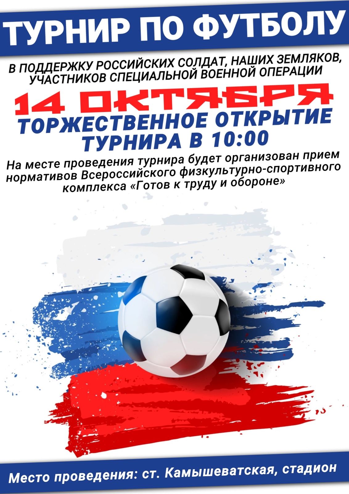 14 октября 2023 г. на стадионе ст. Камышеватской Ейского района пройдет турнир по футболу среди мужских команд сельских поселений
