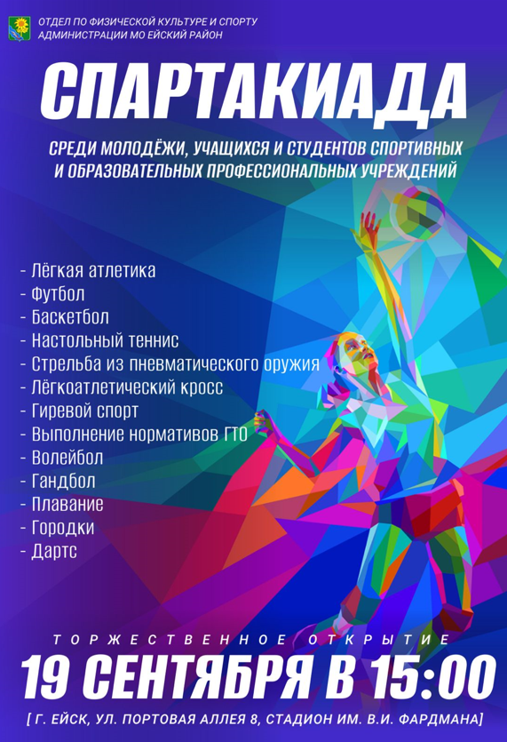 19 сентября на стадионе им. В.И. Фардмана города Ейска состоится торжественное открытие Спартакиады 2024/2025 среди молодежи, учащихся и студентов спортивных и образовательных профессиональных учреждений, расположенных на территории Ейского района.