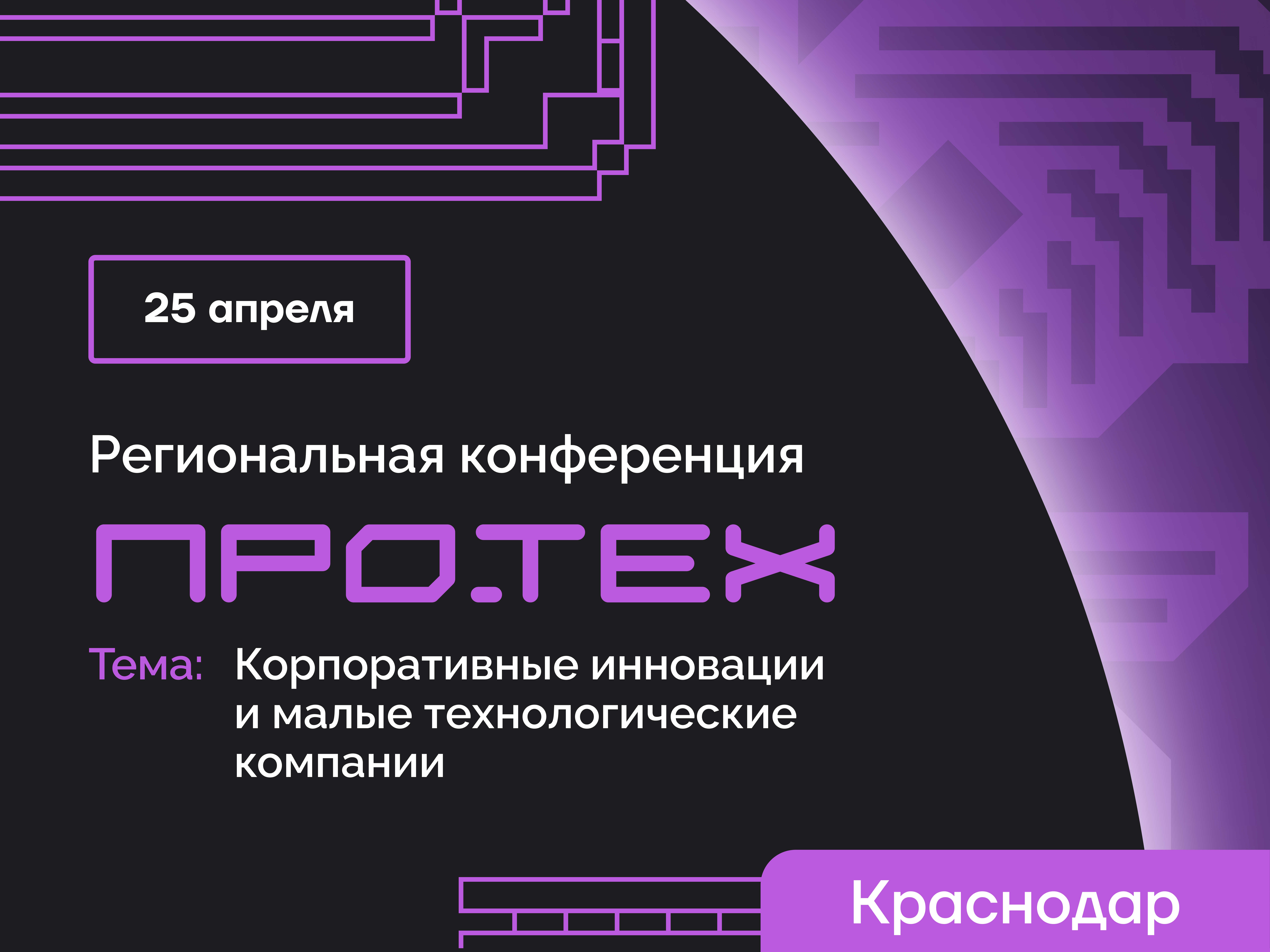 25 апреля 2025 года в Краснодаре, в инновационном центре «Аквариум», состоится шестая региональная конференция «ПРО.ТЕХ» об инновационном развитии бизнеса, трендах и технологиях.