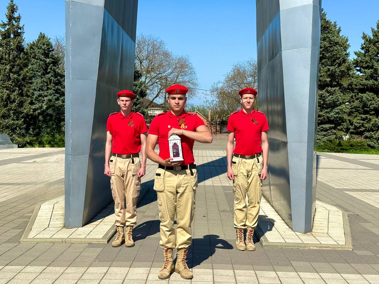 Здесь прошла торжественная передача сборными отрядами Поста № 1 от Ейского района к Каневскому лампады с горящей свечой.