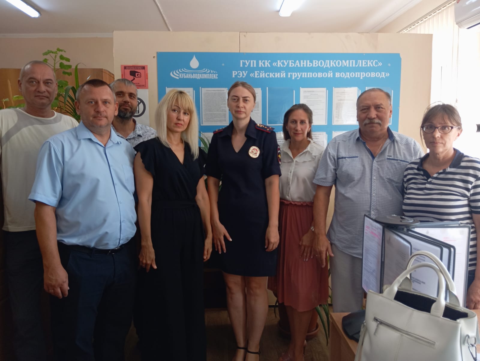 31.07.2025 оперуполномоченным ОНК отдела МВД России по Ейскому району, капитаном полиции Череядьевой Г. Н. для работников ГУП КК «Кубаньводкомплекс» проведено профилактическое антинаркотическое мероприятие, на котором доведены основные меры административной и уголовной ответственности за круговорот наркотических препаратов, а также отдельно проведена беседа по способам мошенничества
