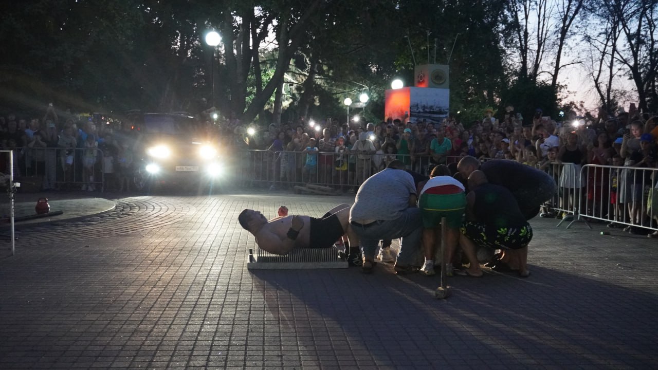 Ну и конечно же «гвоздь программы», который в прямом смысле вьет из этих самых гвоздей косички и сердечки, бессменный участник всех фестивалей «Богатырская сила», один из самых сильных людей в мире. Рекордсмен Книги рекордов Гиннеса, рекордсмен по поднятию тяжестей, чемпион мира по борьбе на поясах Дмитрий Халаджи! Дмитрий гнул гвозди и подковы голыми руками, его переезжал автомобиль весом более 2,5 тонн.