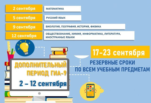 2 сентября пройдет экзамен по математике, 5 сентября - по русскому языку, 9 и 12 сентября пройдут экзамены по предметам по выбору. Резервные дни дополнительного периода пройдут 17, 18, 19, 22, 23 сентября.