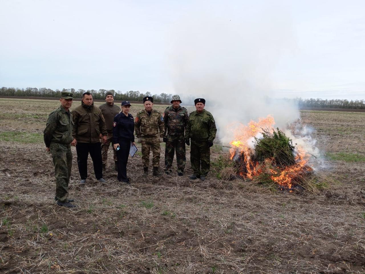 Силами казачьей мобильной группы с участием сотрудников погрануправления ФСБ России по городу Ейску наркосодержащая конопля уничтожена на площади 120 квадратных метров в количестве 2050 кустов способом, исключающим возможность незаконного оборота, с соблюдением требований в области охраны окружающей среды, санитарно- эпидемиологического благополучия населения, пожарной безопасности.