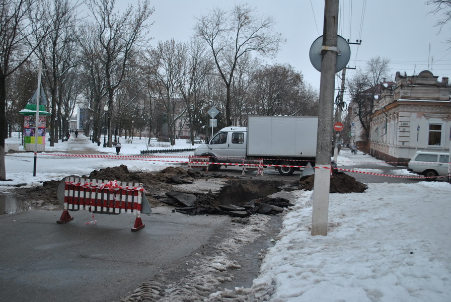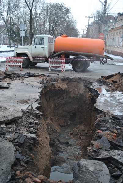 Вчера в районе 17-00 на пересечении улиц Коммунаров и Мира на проезжей части провалился асфальт. В результате образовалась яма полметра в диаметре и около трех метров глубиной. Только по счастливой случайности никто из водителей и пешеходов не пострадал. Сразу же подъезд к месту аварии был перекрыт, туда выехали специалисты администраций города и района, аварийная бригада ООО «ЕйскВодоканал». По мнению специалистов, провал образовался из-за износа канализационных сетей, которые в этом районе города укладывались в сороковых годах прошлого столетия. К сегодняшнему дню износ коммуникаций составил 150%. Труба, выполненная из цементно-песчаной смеси фактически рассыпалась. Прежде чем заменить ее, пришлось из образовавшегося колодца откачивать воду.