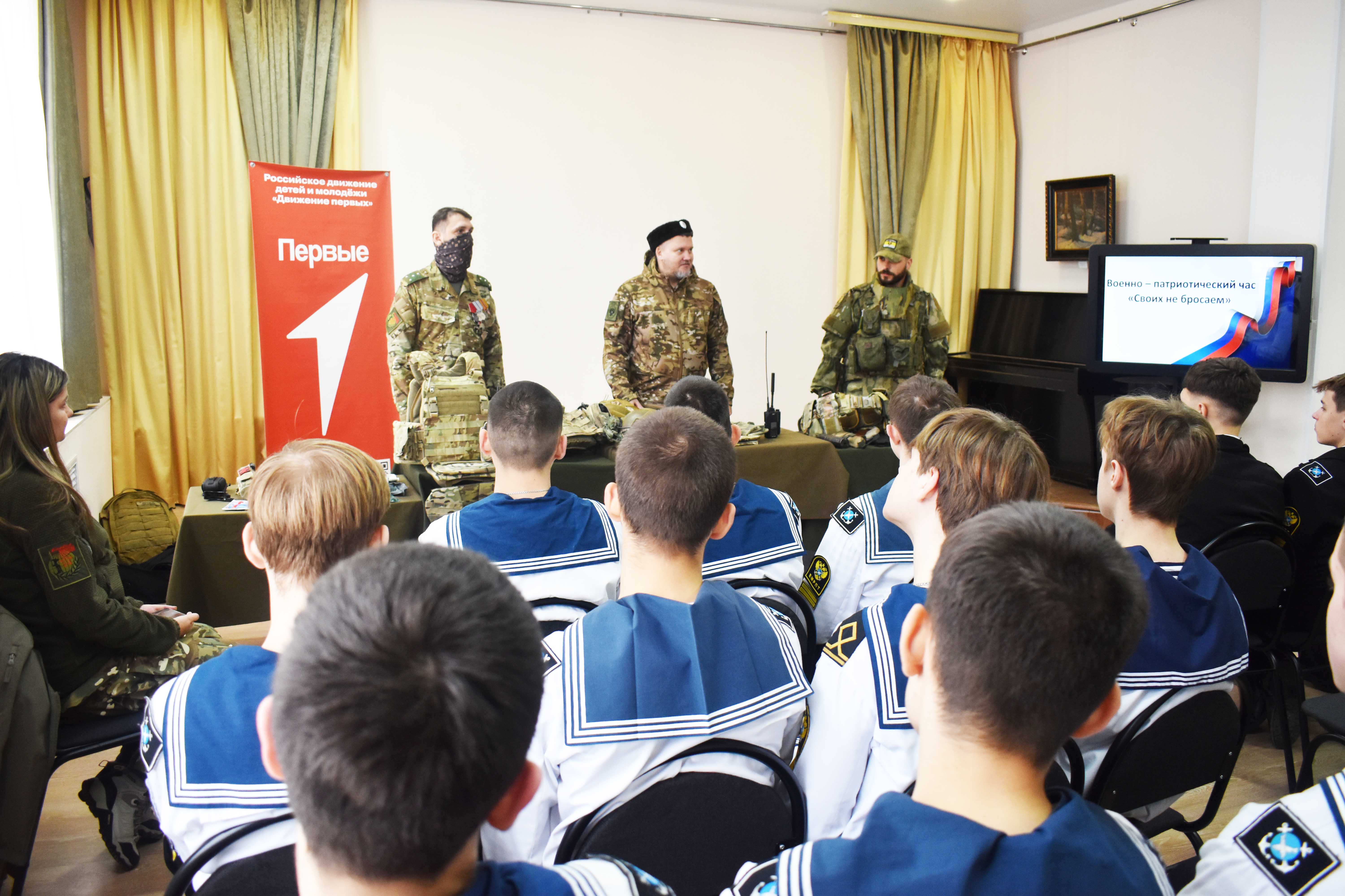 В преддверии праздника и в рамках Всероссийской акции «Наши защитники Отечества» в музее истории города Ейска прошел патриотический час "Своих не бросаем", при участии Первичного Отделения "Движения Первых" Ейского морского рыбопромышленного техникума.